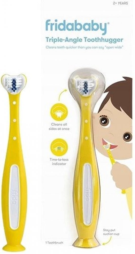 Unikátní dětský 3D zubní kartáček, který vyčistí malé zoubky jedním tahem ze všech tří stran. Bitva začíná! Unikátní 3D hlavice kartáčku útočí na plak čištěním ze všech stran najednou. Kartáček má geniální design, který vyčistí malé dětské zoubky jedním tahem ze všech stran. Dostupný ve 3 barevných provedeních (žlutý, modrý, růžový).Frida Baby Tooth Hugger 3D zubní kartáček