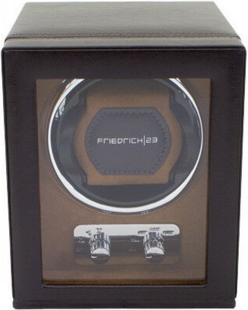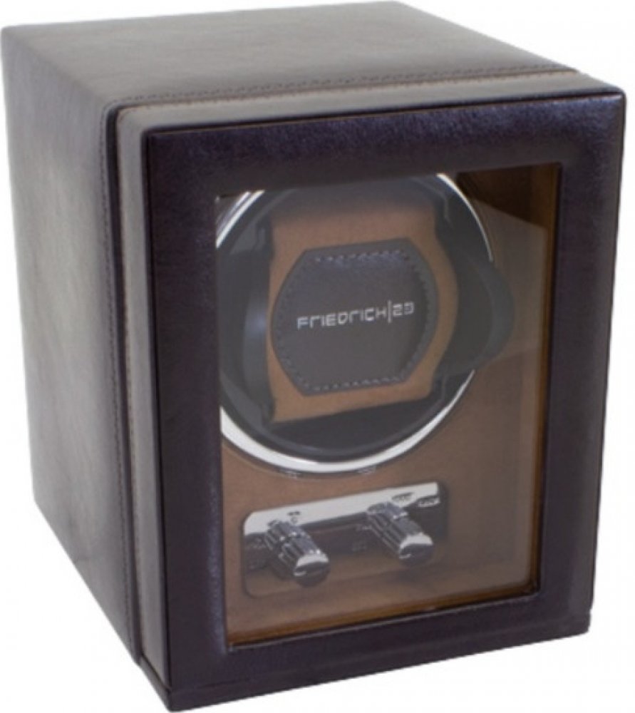 Natahovač Bond pro 1 hodinky, syntetická hnědá kůže, interiér je ve světle hnědé barvě, průhledné přední víko, nastavitelné otáčení doprava, doleva a oboustranně, možnost si zvolit denní otáčky 650, 750, 850, 1000 a 1950, adaptér je součástí balení, lze také napájet pomocí 4 tužkových baterií
