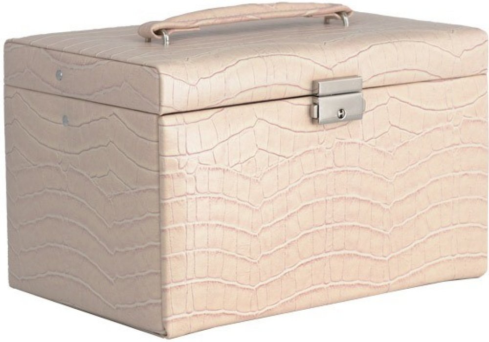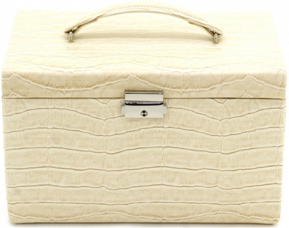 Šperkovnice ze syntetické kůže, vzor krokodýl - barva béžová, vnitřní materiál je velur v šedé barvě, je uzamykatelná, 4 patra pro uložení šperků, zrdcadlo na vnitřní straně víka