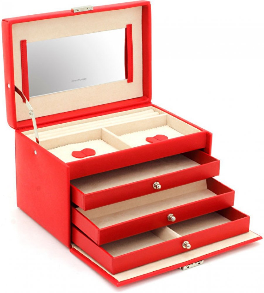 Luxusní šperkovnice FRIEDRICH LEDERWAREN 23256-40 výrazné červené barvy je nádherným dárkem pro každou ženu. Skvěle slouží pro uschování šperků, hodinek a dalších klenotů, které tak budou přehledně uspořádané, bezpečně uložené a zároveň chráněné před poškozením. Čtyřpatrová šperkovnice ve tvaru kufříku nabízí tři šuplíky a horní plato pro šperky, které nosíte nejčastěji. Na vnitřní straně víka se nachází praktické zabudované zrcátko. Díky madlu na horní straně víka se vám bude pohodlně přenášet a můžete si ji tak vzít s sebou i na cesty. Klíčové vlastnosti šperkovnice FRIEDRICH LEDERWAREN 23256-40 červené barvy Čtyřpatrová šperkovnice ve tvaru kufříku Ze syntetické červené kůže se vzorem příčných vláken Přehledné a bezpečné uschování šperků Tři šuplíky a horní plato Praktické zabudované zrcátko Uzamykatelné víko Skvělý pomocník pro bezpečné uložení vašich klenotů Vrchní část šperkovnice je vyrobena ze syntetické kůže ozdobené vzorem příčných vláken, uvnitř se nachází příjemný velur béžové barvy. Velkou vymožeností je, že můžete šperkovnici uzamknout, díky čemuž máte vaše cennosti uschovány jako v trezoru. Chraňte své poklady a uložte je do této krásné šperkovnice FRIEDRICH LEDERWAREN 23256-40, která je symbolem elegance a luxusu. Doplňující informace: Rozměry: 20,5 × 15 × 16 cm Barva: Červená, béžová