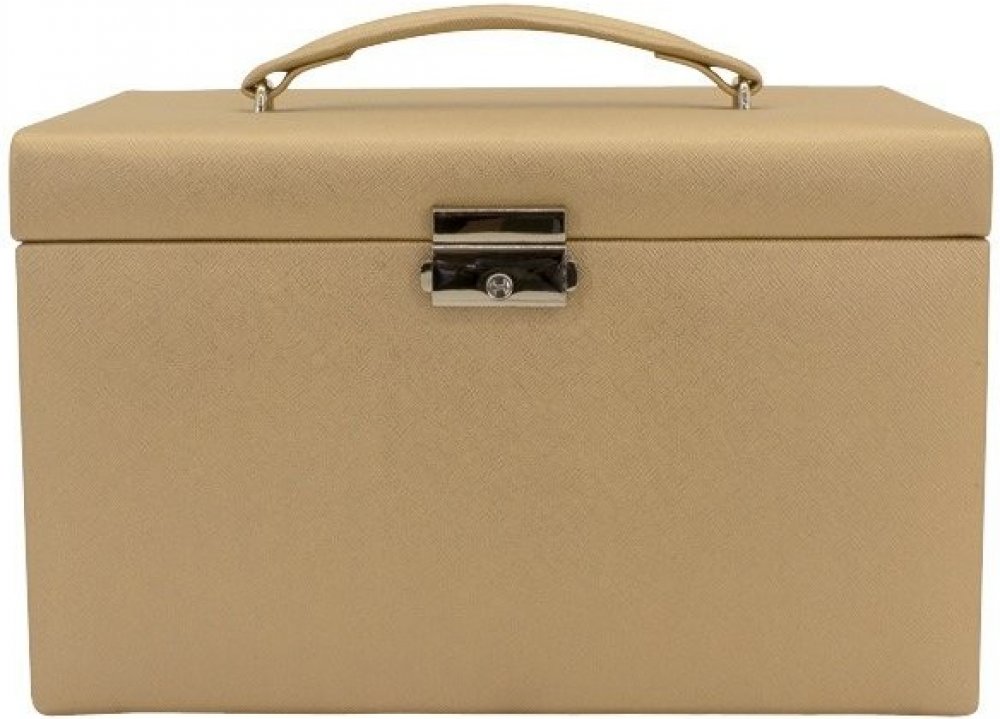 Šperkovnice ze syntetické kůže, vzor příčných vláken - barva zlatá, vnitřní materiál je velur v béžové barvě, je uzamykatelná, 4 patra pro uložení šperků, zrcadlo na vnitřní straně víka. Šperkovnice poskytuje prostor pro praktické uskladnění prstenů, náušnic, přívěsků, náramků a dalších cenností.
