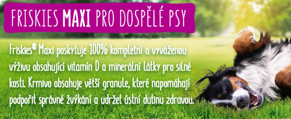 FRISKIES Maxi s vyšším obsahem masa Krmivo FRISKIES Maxi poskytuje 100procent kompletní a vyváženou výživu s vyšším obsahem vápníku a vitamínu D pro silné kosti. Krmivo má vyšší obsah masa s hrubšími kousky, které podporují důkladné žvýkání a udržují dentální zdraví. Kompletní granulované krmivo Denní krmná dávka (g/den) a #160; a #160; a #160; Velikost psa a #160; a #160; a #160; Denn...