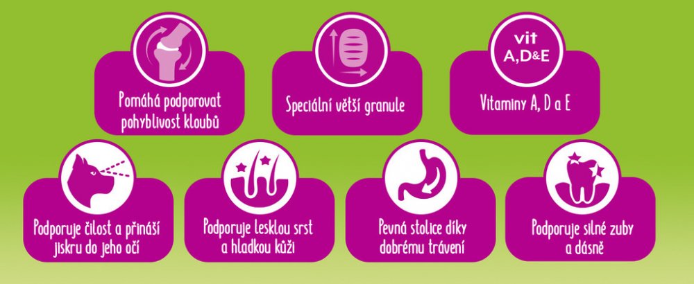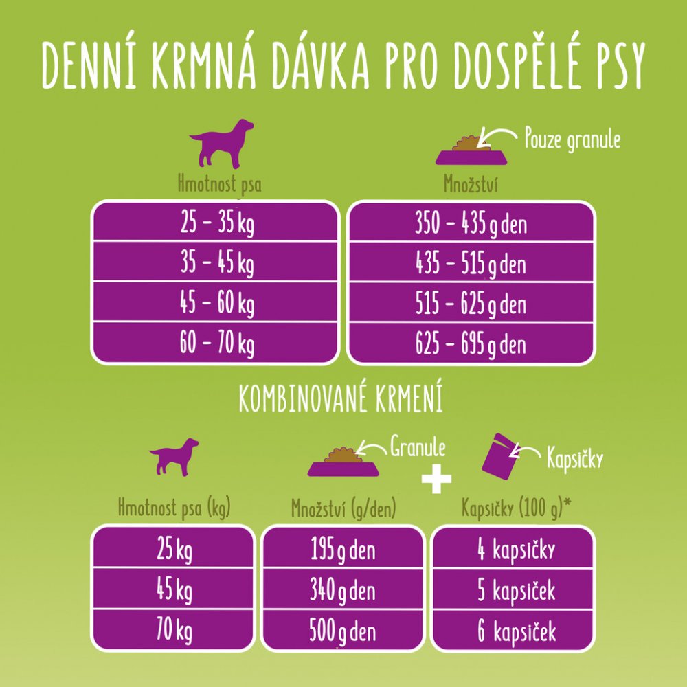 FRISKIES Maxi s vyšším obsahem masa Krmivo FRISKIES Maxi poskytuje 100procent kompletní a vyváženou výživu s vyšším obsahem vápníku a vitamínu D pro silné kosti. Krmivo má vyšší obsah masa s hrubšími kousky, které podporují důkladné žvýkání a udržují dentální zdraví. Kompletní granulované krmivo Denní krmná dávka (g/den) a #160; a #160; a #160; Velikost psa a #160; a #160; a #160; Denní dávka Velký a #160; a #160; a #160; 25 - 45 kg a #160; a #160; a #160; 360 - 530 Gigant a #160; a #160; a #160; 45 - 70 kg a #160; a #160; a #160; 530 - 735 Tyto průměrné hodnoty pro dospělé psy platí pro běžně aktivní psy v normálním prostředí za běžných teplot. Jednotlivé potřeby se mohou lišit a krmení musí být upraveno podle potřeby tak, aby byla psovi udržována štíhlá linie a zdravá tělesná váha. K dispozici musí být vždy čerstvá a čistá voda. Deklarované jakostní znaky Surový protein a #160; a #160; a #160; 23,0 procent Surový tuk a #160; a #160; a #160; 11,0 procent Surový popel a #160; a #160; a #160; 8,0 procent Surová vláknina a #160; a #160; a #160; 3,0 procent Vápník a #160; a #160; a #160; 1,5 procent Fosfor a #160; a #160; a #160; 1,2 procent Složení Obiloviny, maso a živočišné deriváty (min. 14 procent masa), zeleninové proteinové extrakty, deriváty rostlinného původu, oleje a tuky, minerály, síran měďnatý (měď = 10 mg/kg), aditiva EEC: barviva, antioxidanty a konzervační látky. Vitamín A a #160; a #160; a #160; 14 000 IU/kg Vitamín D3 a #160; a #160; a #160; 650 IU/kg Vitamín E (alfa-tokoferol) a #160; a #160; a #160; 80 mg/kg Obsah vitaminů je zaručen do data minimální trvanlivosti.