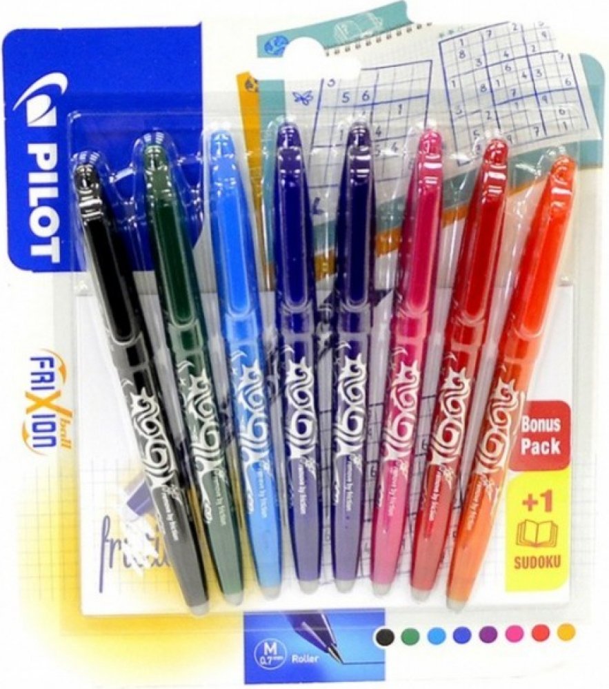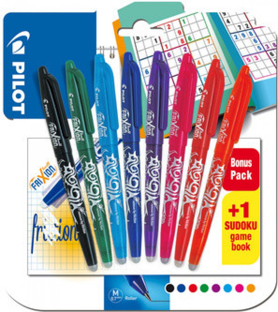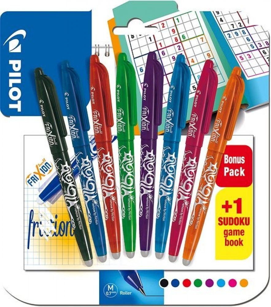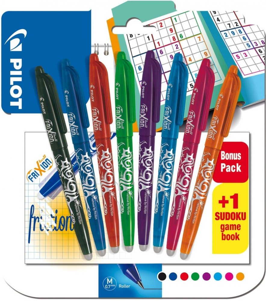 Frixion sada Ball - Sudoku - 8 ks - 23888.Kuličkové pero (roller) Pilot Frixion Ball gumovatelné. Roller s unikátním inkoustem, který lze zneviditelnit třením ( při -15°C se inkoust znovu objeví). Žádný odpad po tření. Neobsahuje chemikálie. Stopa šíře 0,4 mm. Barva těla odpovídá barvě náplně. Balení obsahuje: 8 barev Frixion Ball - černá, zelená, sv. modrá, modrá, fialová, růžová, červená, oranžová+ sudoku navíc.
