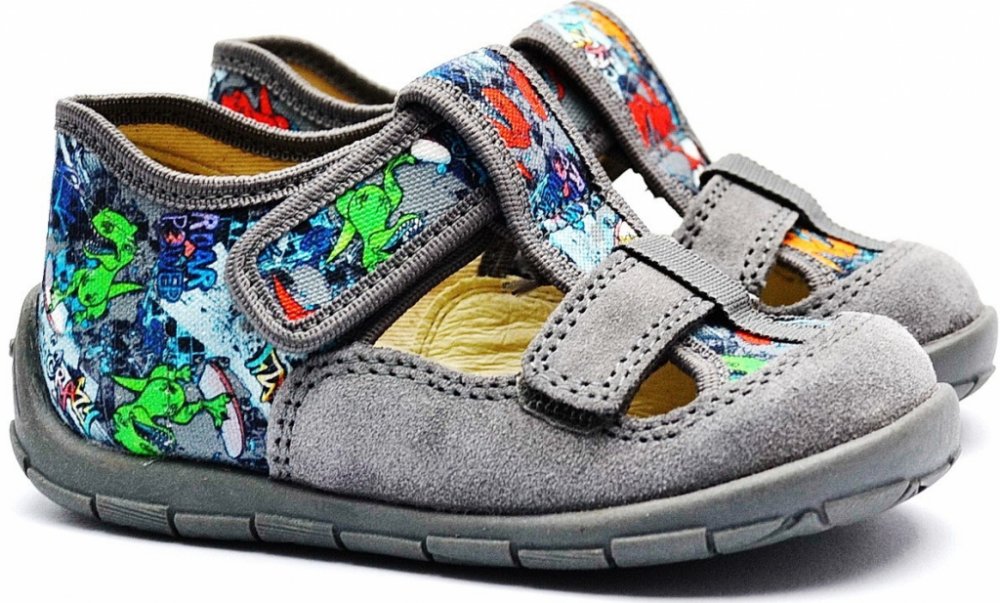 Dětské bačkůrky s nastavitelným nártem, pevným opatkem a tvarovanou koženou stélkou. Výhodou je ohebná podešev s Shock absorber, který změkčuje došlap a zapínání na suchý zip, které usnadňuje nazouvání. Díky suchému zipu v místě nártu vhodné i pro děti s vyšším nártem.
