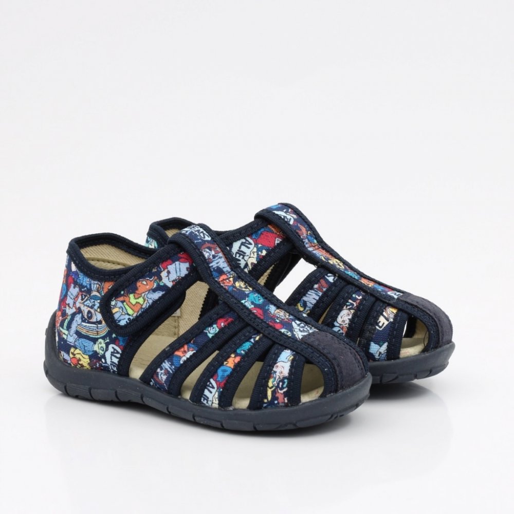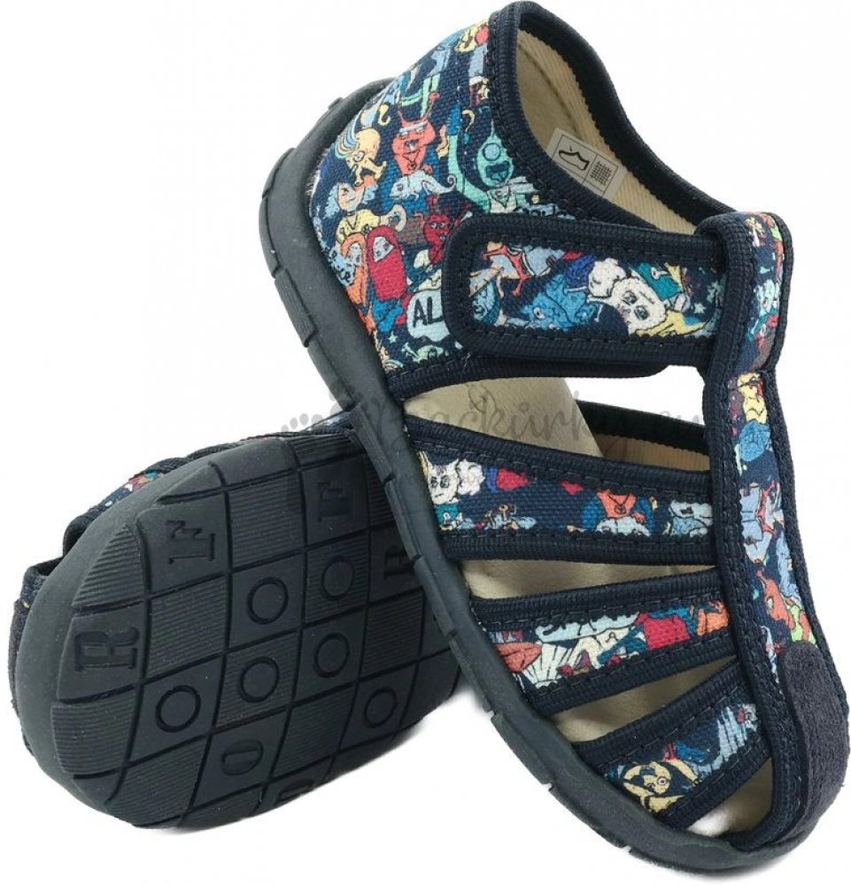 Papuče v tmavě modré barvě, vyrobené z nejkvalitnějšího textilního materiálu. Variabilní obuv dostatečně stabilní a pružná, vnitřek vystlaný měkkým materiálem, který chrání před odřením. Anatomická kožená stélka - správně formuje správný vývoj chodidla. Vyztužená pata a správná výška svršku zajišťuje stabilitu. Zapínání nastavitelné dlouhým suchým zipem. Snadno se nasazuje a sundává díky dobré zasouvací schopnosti. Podešev pružná a protiskluzová.