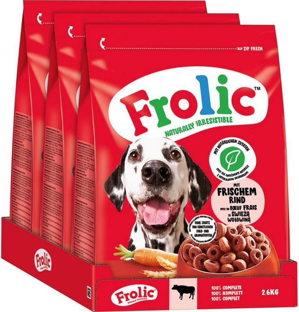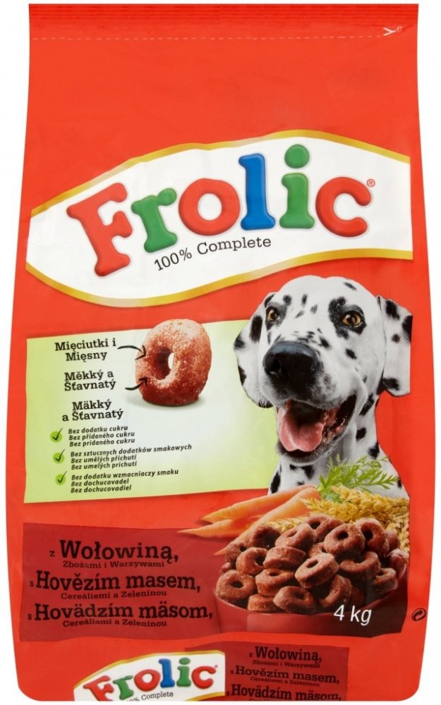 Frolic s Hovězím je vyvážené suché krmivo, které Vašemu mazlíčkovi den za dnem nabízí to, co potřebuje. Vysoce kvalitní a vyvážené ingredience jsou pečlivě připravené. Čerstvé hovězí maso slouží jako vynikající zdroj živočišných bílkovin, které jsou díky výborné chuti psy dobře přijímány. Zdravá zelenina a cenné obiloviny ucelují toto krmivo. Důležité vitamíny a minerály podporují zdraví, vitalitu...