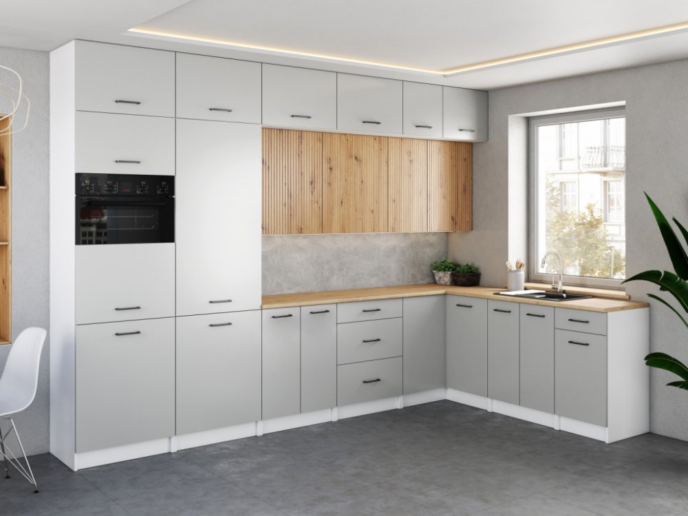 Rohová kuchyně WERIA je prostorná kuchyňská sestava, která skvěle zapadne do větších prostorů vašeho domova. Rohová sestava obsahuje všechny potřebné skříňky, jako jsou užitkové sloupky, instalace mikrovlnné trouby, dřez, závěsné a stojací skříňky a prostorné nástavce. To vám umožní zařídit si kuchyni vhodným a funkčním způsobem. WERIA se skládá z až 17 skříněk umístěných v úhledné rohové konstruk...