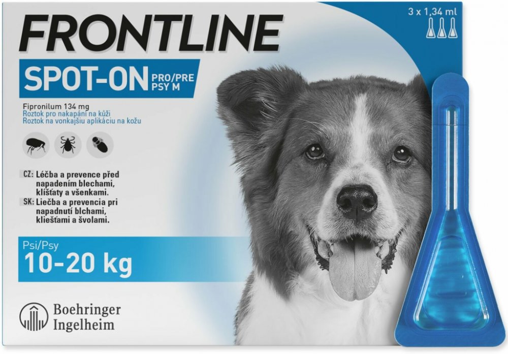 Frontline Combo Spot-On Dog M 1x1,34ml - velmi účinný přípravek k ochraně psů před blechami, klíšťaty a všenkami. Frontline Combo účinkuje okamžitě po aplikaci, roztok je zcela voděodolný. Ihned parazity zahubí a zničí veškeré larvy a vajíčka. Přípravek nezapáchá, nešpinía nemastí srst.