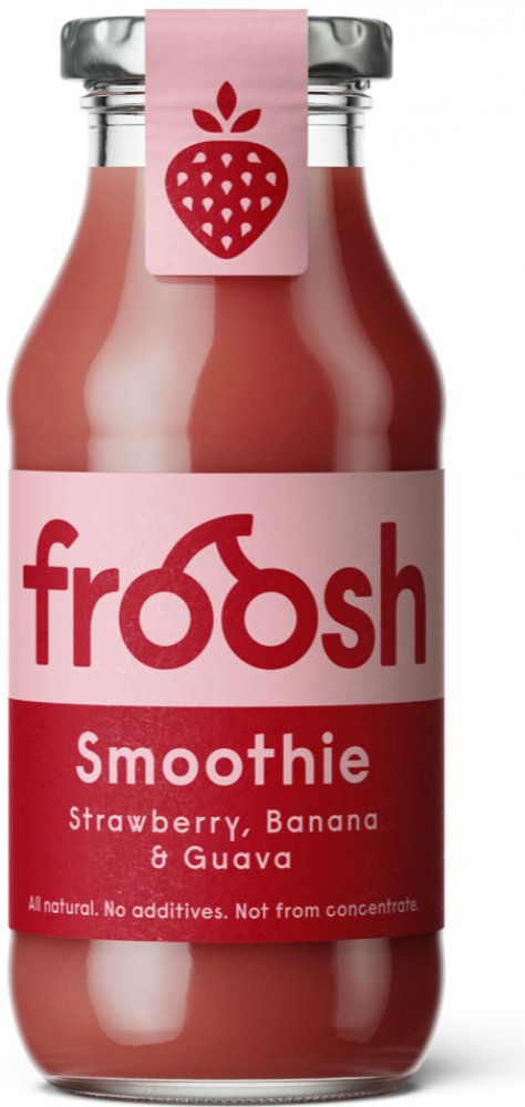 Froosh Smoothie jahoda, banán a guava 250 ml. Velice chutné smoothie 100% ovoce jemně zpracované. Smoothie Froosh je svojí chutí, složením a konzistencí ideální jako rychlá snídaně, nebo svačina “to-go”, kterou můžete mít vždy po ruce. K výrobě je využíváno pouze kvalitní ovoce, které je dováženo z rozvojových zemí v duchu fairtrade. V lahvičce není nic jiného než ovoce, či zelenina. Výhody: možnost skladovat v pokojové teplotě ekologické balení ve skle je bez jakýchkoliv přidaných látek, či cukru Složení : ¾ lisované jablko, 8 jahod (15%), 1/3 banán (13,0%), guava (5%), 8 bobulí aronia, mučenka. Země původu: Švédsko