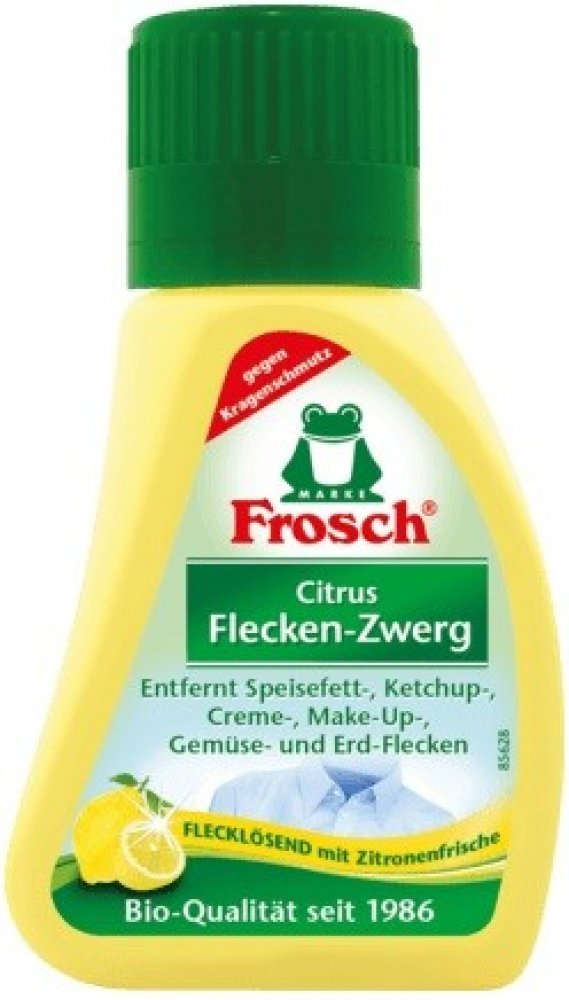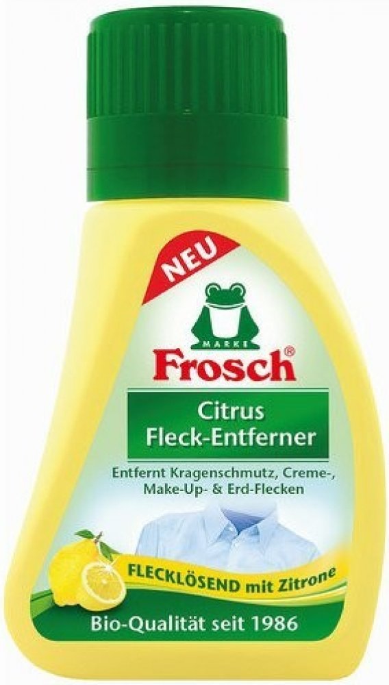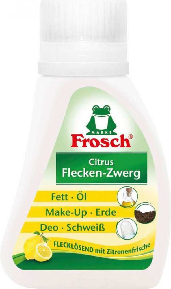 Německý Frosch Citrus, ekologický odstraňovač skvrn, 75 ml. Ekologické čističe a odstraňovače skvrn a fleků Frosh Citrus s vůní citrónu odstraňují skvrny od make-upu a trávy nebo hlíny. Účinný a spolehlivý Frosch Citrus, odstraňovač fleků, 75 ml je vhodný na bílé a barevné prádlo. Velmi kvalitní a oblíbený Frosch Citrus není vhodný na hedvábí. Vynikající čistící účinek zabere i tam, kde mnoho běž...