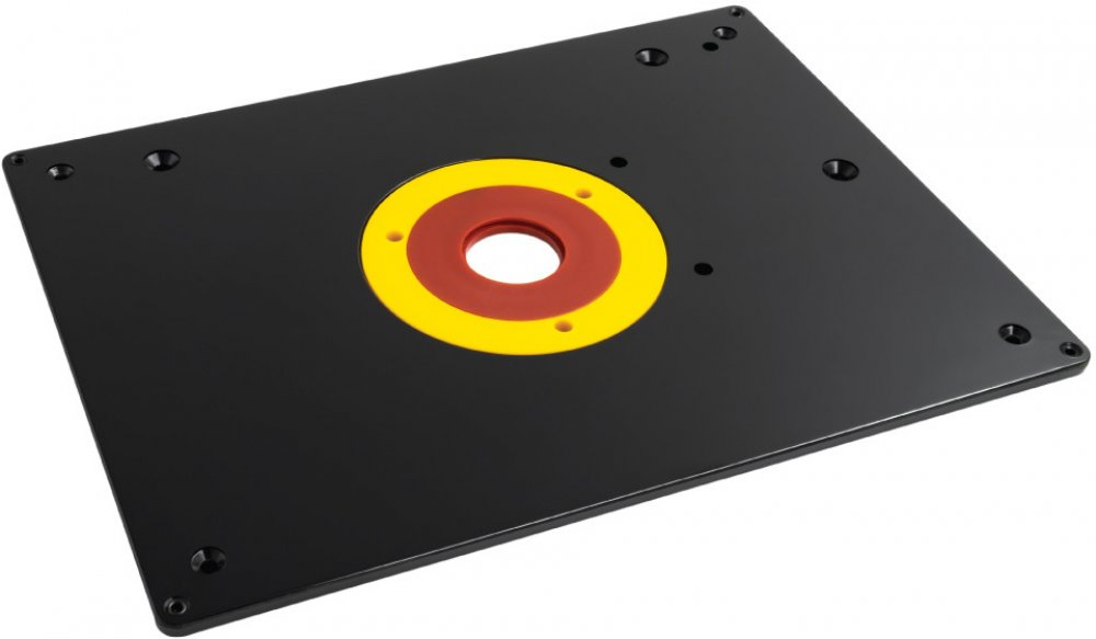 Tato středová frézovací deska poskytuje pevnou a stabilní plochu pro upnutí Vaší horní frézky do Vámi vyrobeného frézovacího stolku nebo desky pracovního stolu, ponku či hoblice. Středová frézovací deska je bez otvorů pro upnutí horní frézky a je vyrobena z 6 mm hladkého plastu v černé barvě. Je vybavena 4-mi vyrovnávacími šrouby pro ustavení do roviny s pracovní deskou frézovacího stolku. Dodávaná se 2-mi odjímatelnými středovými kroužky pro upnutí různých velikostí stopkových fréz o průměru do 30 mm, do 66 mm. Maximální středový otvor desky je 98 mm. Pomocí přiloženého kopírovacího kolíku můžete volně frézovat jakékoliv tvary. Rozměry středové desky jsou 306 mm x 229 x 6 mm. Pro upnutí frézky je nutno do středové desky vyvrtat upínací otvory pro šrouby.