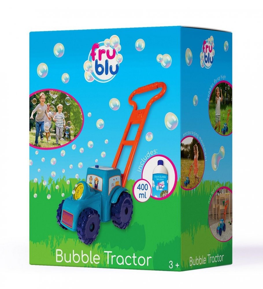 FRU BLU TRAKTOR + tekutina 0,4L. Bublinový stroj v podobě traktoru vybízí dítě k tlačení, aktivuje jeho pohyb a poskytuje skvělou zábavu. Na rozdíl od podobných výrobků je traktor Fru Blu chráněn proti rozlití tekutiny při hře díky použití uzavřené láhve našroubované na výrobek.
