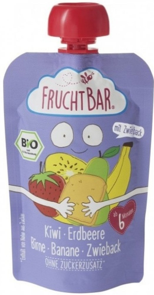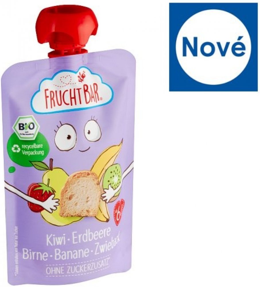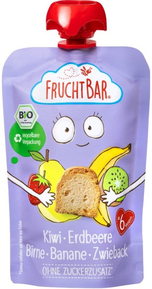 FruchtBar BIO ovocná kapsička FruchtBar BIO ovocná kapsička přináší kombinaci jahod, banánů, hrušek, kiwi a sucharů, ideální pro děti od ukončeného 6. měsíce. Tato chutná a praktická svačinka je perfektní pro cestování, výlety nebo každodenní použití. Kapsička je vyrobena z ingrediencí v BIO kvalitě a díky recyklovatelnému obalu přispívá k ochraně životního prostředí. Od 7. měsíce Vhodné od 100 g ...
