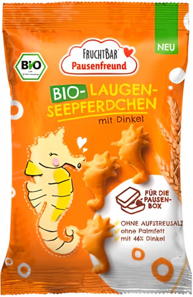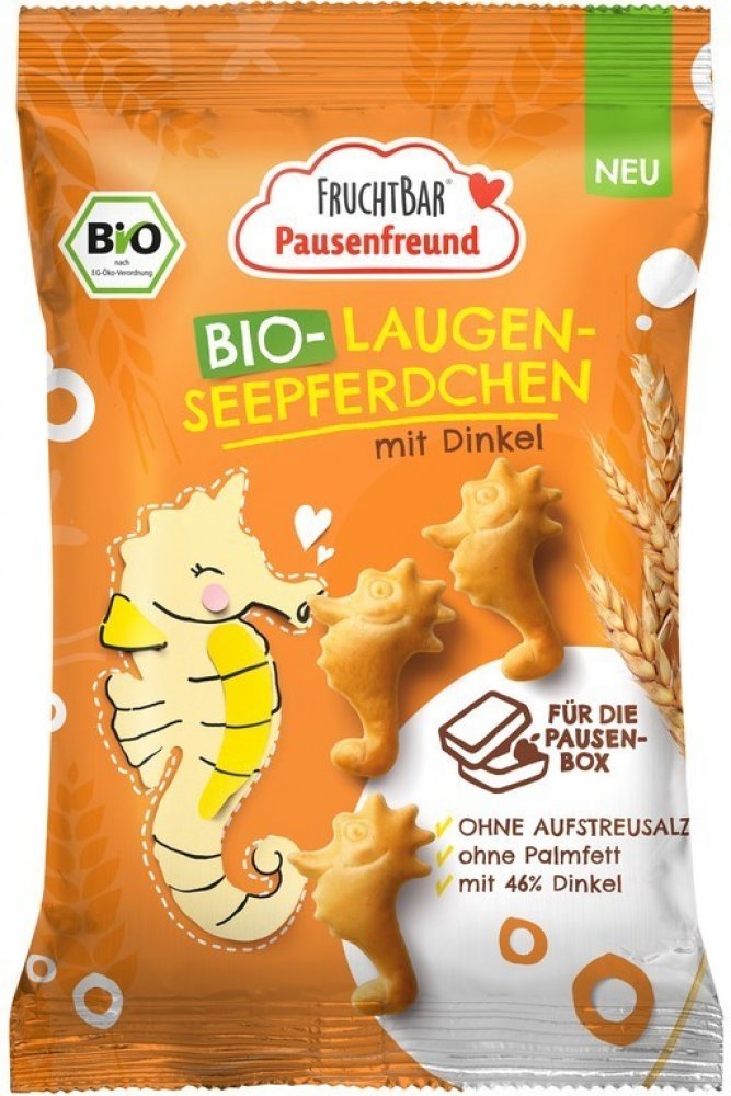 Špaldové krekry ve tvaru mořského koníka v BIO kvalitě vhodné od ukončeného 3. roku. Bez přidaného cukru. Výrobek z certifikovaného ekologického zemědělství. BIO Špaldové křupavé krekry Mořský koník, 90 g Nezapomínáme ani na starší děti nad 3 roky. Právě pro ně jsou určené špaldové křupavé krekry, se kterými budou ve škole za hvězdy a které jim udělají radost na každém výletě. Jsou v BIO kvalitě, bez přidaného cukru, bez palmové oleje a bez slaného posypu. Výrobek z certifikovaného ekologického zemědělství. O značce: FruchtBar je oblíbená německá značka, která učí děti jíst zeleninu a ovoce. A my věříme, že si ji oblíbíte i vy! Na prvním místě je kvalita. Všechny výrobky jsou BIO, bez přidaného cukru a dalších chemických přísad. Zaměřují se na nejmenší děti od 6. měsíců, ale nabízí výrobky i pro děti od ukončeného 1. roku a pro děti od 3 let. Díky tomu i starší děti mohou jíst zdravě a chutně. Najdete zde oblíbené kapsičky, křupky, sušenky, ale i cereálie nebo jedinečnou řadu hotových jídel a omáček Složení: pšeničná špaldová mouka 46%, pšeničná mouka 46%, řepkový olej, extrakt z ječného sladu, kvasnice, sůl, kypřící látka (uhličitany sodné), regulátor kyselosti (hydroxid sodný). Obsahuje lepek! Může obsahovat stopy vajec, mléka, ořechů a sezamu. Výživové hodnoty na 100 g: Energie 1895kJ/451kcal, tuky 15g, z toho nasycené mastné kyseliny 1,2g, sacharidy 66g, z toho cukry 1,6g, vláknina 3,9g, bílkoviny 11g, sůl 1,4g.