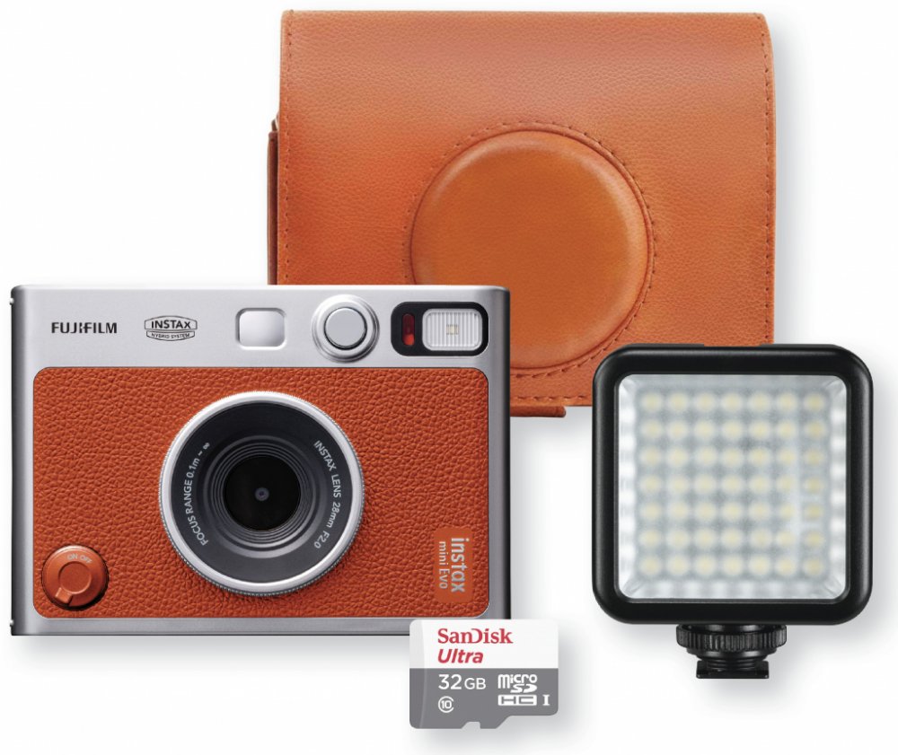 Set obsahuje (fotoaparát Instax Mini Evo, pouzdro, LED světlo, pamětovou kartu Micro SD 32GB)