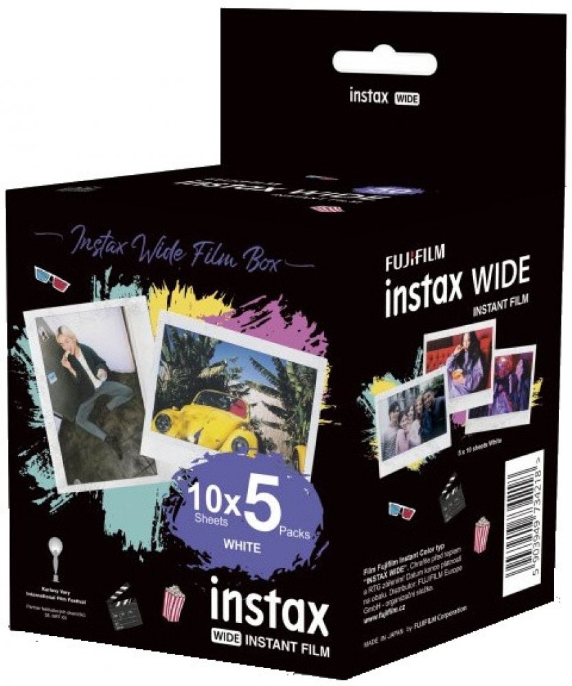 Instax Wide film je určený pro milovníky širokoúhlých snímků a větších formátů. Tento výhodný 5-pack obsahuje celkem 50 fotografií, rozdělených do pěti kazet po deseti kusech – ideální pro akce, večírky i každodenní focení.