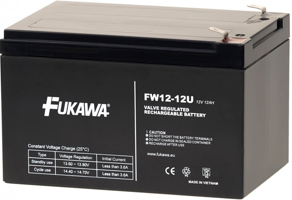 Akumulátory Fukawa jsou vhodné jako náhradní baterie pro záložní zdroje UPS, RBC kity, zdravotnickou techniku, elektronické systémy (EZS, EPS, CCTV) apod. Technické parametry: Napětí: 12V Kapacita: 12Ah Připojení: F2 (faston 250 - 6,3mm) Rozměry: 151x98x95mm Teplotní rozsah při vybíjení: -20 ~ 60°C Akumulátory Fukawa jsou hermeticky uzavřené, ventilem řízené s technologií AGM (elektrolyt vázaný ve skelné tkanině) díky čemuž je lze provozovat v libovolné poloze a nevyžadují žádnou údržbu.