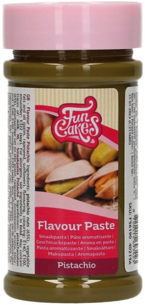 Složení: pistáciové oříšky (65 %), rostlinné tuky a olej (palmový, řepkový, slunečnicový), aroma , barvivo: E140, E100, emulgátor: E322 ( sója ).