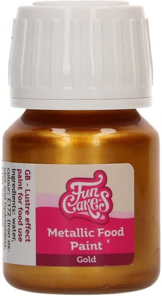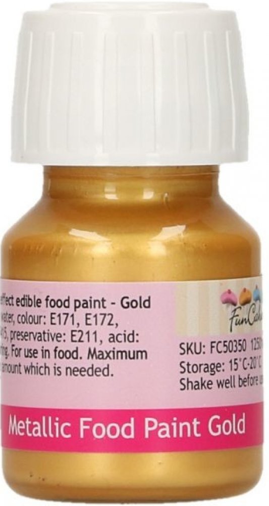 S touto metalickou barvou docílíte elegantní efekty na fondánu, marcipánu, královské glazuře, bílkové polevě apod. Barva je jednoduchá na použití, nejprve ji řádně protřepejte a poté nanášejte štětcem na požadovaný povrch. Barva je 100% jedlá, dobře zasychá a po natření není lepkavá. Tip: barvu lze natřít i na těsto a zapéct (sušenky, perníčky). Výrobek má potom krásný lesklý povrch. Před použitím řádně protřepat! Složení: voda, barvivo: E171,E172, zahušťovadlo: E415, konzervant: E211, regulátor kyselosti: E330, aroma.