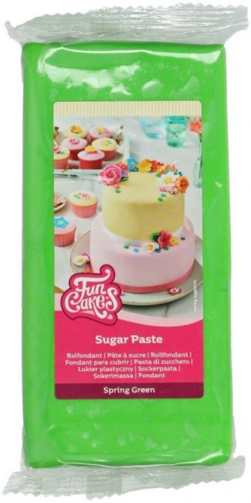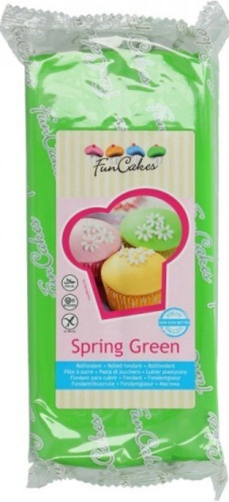 FunCakes potahový fondán je mimořádně flexibilní a snadno použitelný díky své měkké struktuře. Fondán tvrdne po použití, ale nepraská. Barva je zelená.