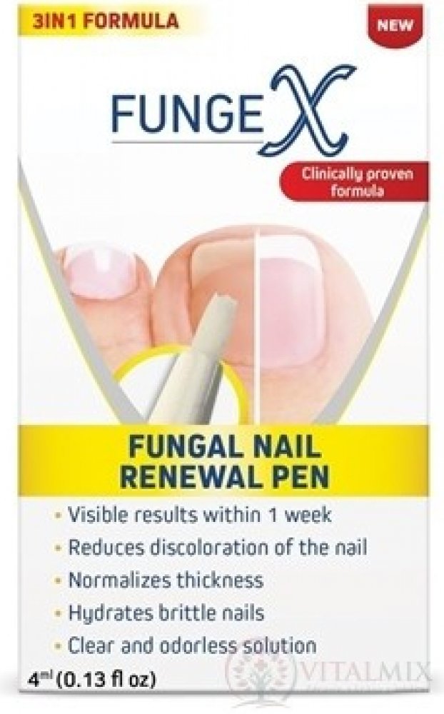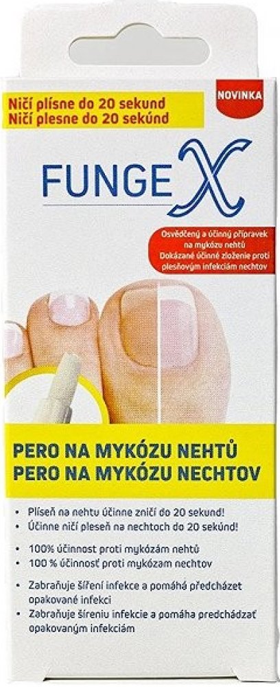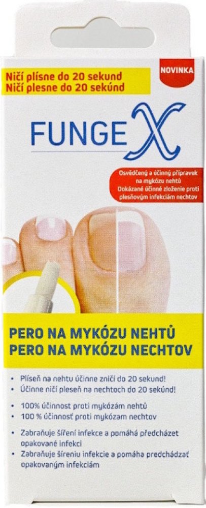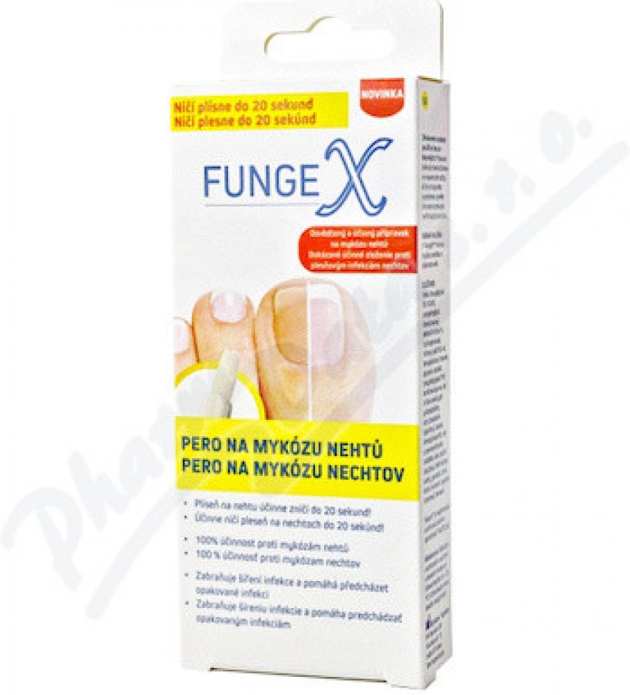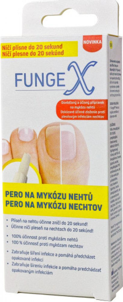 Způsob použití: FungeX® Přípravek na mykózu nehtů díky unikátní kombinaci složek vytváří vrstvu, která v nehtové plotýnce vytváří nepříznivé prostředí pro růst plísní. Také vytváří fyzickou bariéru, která zabraňuje šíření plísní. FungeX® Přípravek na mykózu nehtů snižuje kyselost nehtu, čímž vzniká nepříznivé prostředí, které zastavuje růst a šíření plísní.