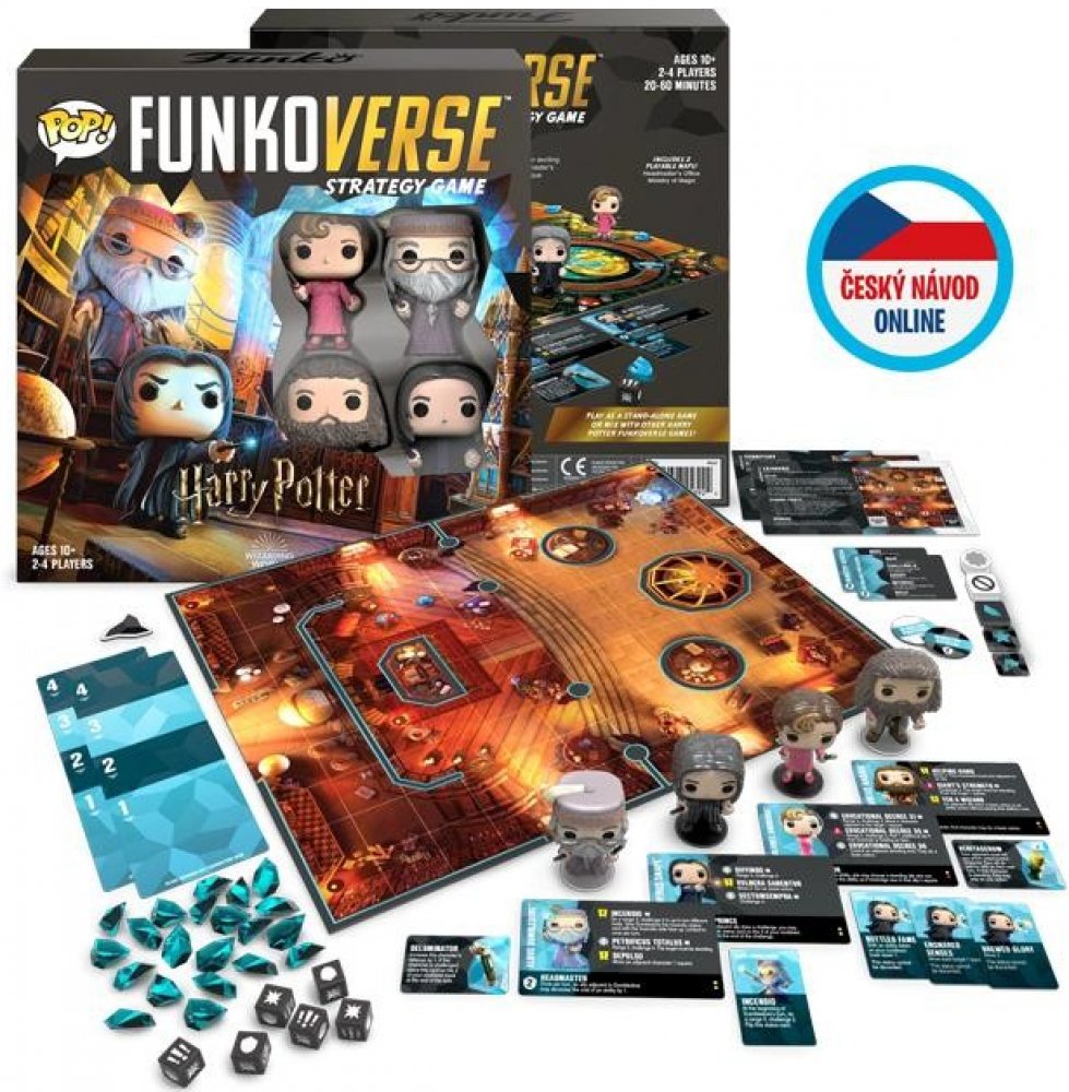 Základní sada pro deskovou hru POP! Funkoverse obsahující základní mapy, 4 figurky a vše nezbytné pro hraní této akční deskové hry. Tato edice vás zavede do Bradavic v mapách jako je Brumbálova pracovna nebo Ministerstvo kouzel. V balení také najdete figurky a herní karty od Dolores Umbridge, Albuse Brumbála, Reubeuse Hagrida a Severuse Snapa. PÁNEM HERNÍ PLOCHYFunkoverse je akční desková hra, ve které se svými oblíbenými sběratelskými figurkami budete buď sami nebo v týmech po dvou bojovat se soupeři o tom kdo je na herní ploše pánem! PÁNEM HERNÍ PLOCHYKaždá figurka má svou kartu schopností, která určuje její sílu v boji a mimo něj. Dále na herní desce najdete různé speciální akce, které můžete během svého tahu vykonat, abyste získali nad svými soupeři rozhodující výhodu. Pokud se stane, že by byla jedna z vašich figurek poražena budete mít možnost jinou figurkou ji postavit zpět do boje! Rychlá a akční hra zabaví každého a obzvláště tedy sběratele POP! figurek. Doporučený věk: 10+Doba jedné hry: 20-60 minPočet hráčů: 2-4Jazyk: AngličtinaV nabídce máme i jiné Funkoverse sety a jejich rozšíření!