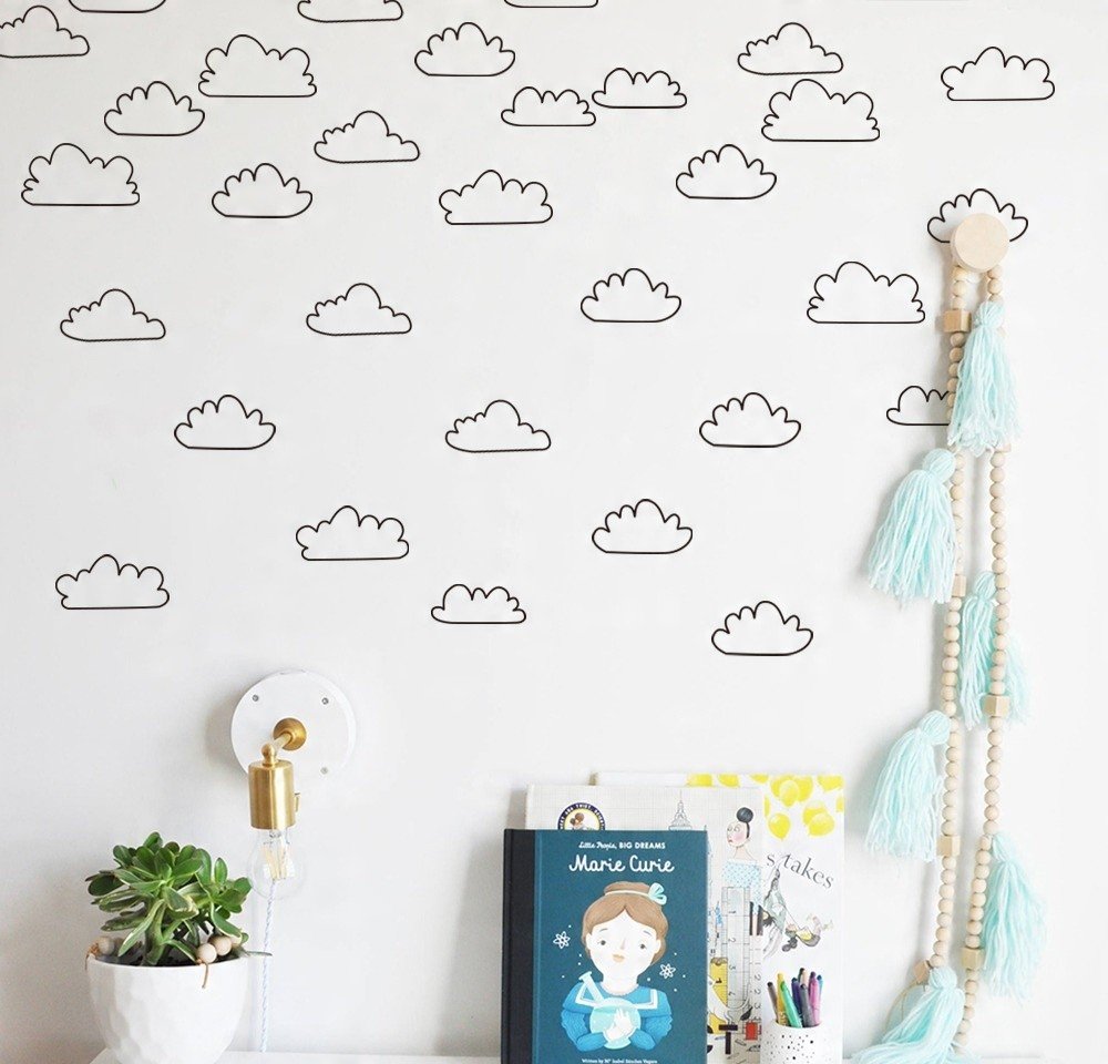 Originální doplněk do dětského pokoje v podobě obláčkových nálepek. Jsou v neutrální černobílé barvě, a tudíž se budou hodit do jakéhokoliv interiéru. Samolepky lze nalepit na jakýkoliv hladký povrch a zase jednoduše odlepit.