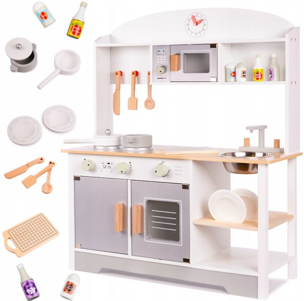 Všechny prvky (kromě dřezu) jsou vyrobeny ze dřeva. Všechny byly pečlivě obroušeny a natřeny netoxickou barvou - to vše pro bezpečnost vašeho děťátka.