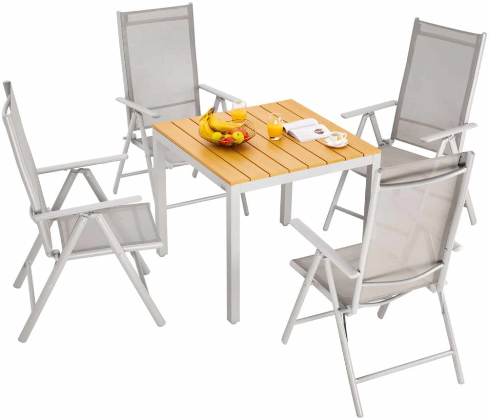 Kvalitní hliníková sedací souprava Bern nabízí prostor až pro 4 osoby. Souprava sestává ze zahradního stolu s WPC stolovou deskou a 4 skládacích židlí s vysokým opěradlem. Všechny trouby a vzpěry jsou vyrobeny z robustního hliníku s práškovým nástřikem a jsou spojeny nerezovými šrouby. Židle lze zatížit až 120 kg a stůl 100 kg. Díky 7-násobné nastavitelnosti zádové opěrky židlí, můžete na nich rel...