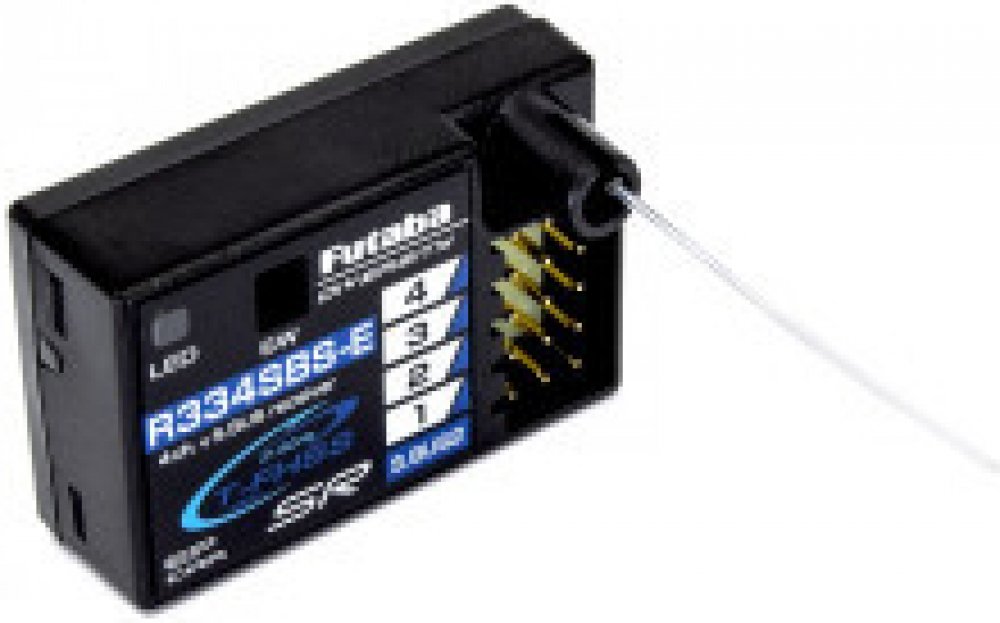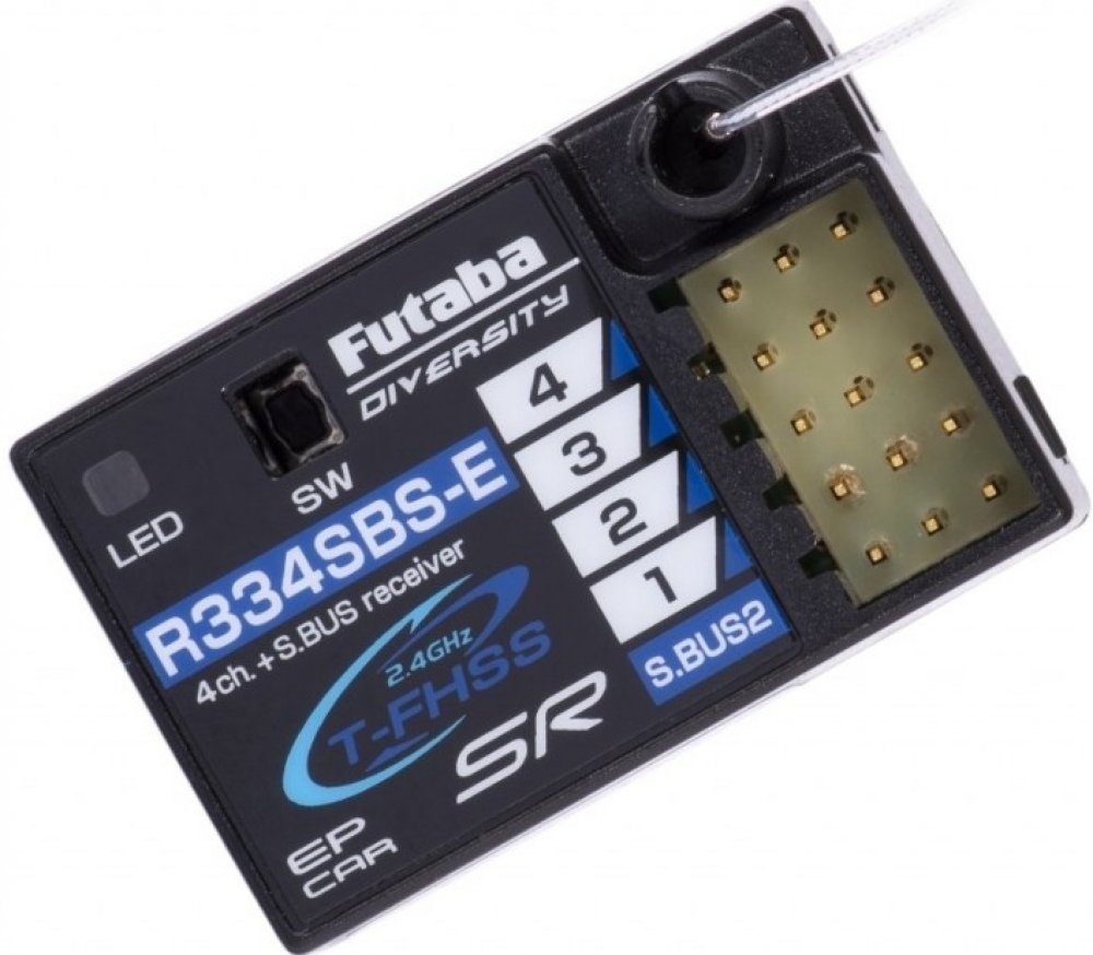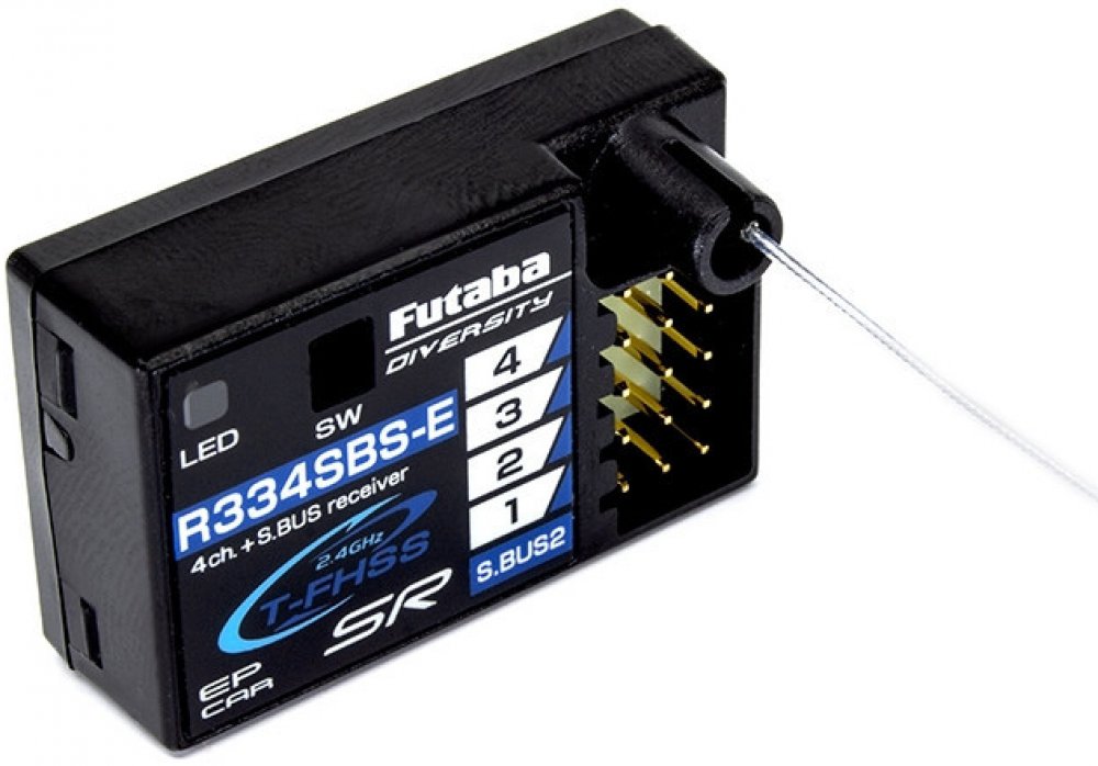 Futaba R334SBS-E T-FHSS 4k přijímač Futaba. Přijímače. Čtyřkanálový telemetrický přijímač Futaba T-FHSS SR/T-FHSS-2.4GHz pro RC auta s elektrickým pohonem. Port S.BUS2 pro telemetrické senzory. Napájení: 3,7–7,4 V, rozměry: 33,9×22,3×11,3 mm, hmotnost: 7,2 g. Diverzitní antény (1 vestavěná). Omezený dosah.