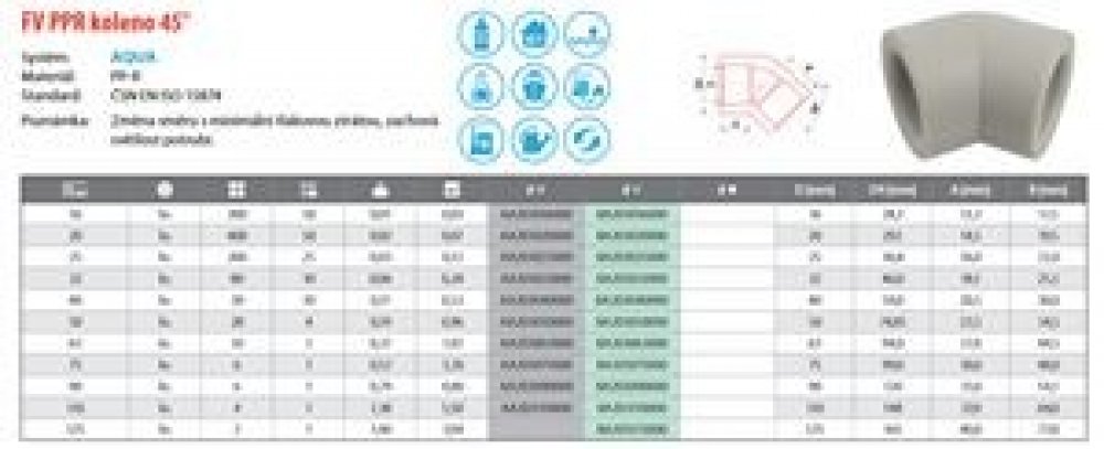 • Systém: FV AQUA• Materiál: PPR• Standard: ČSN EN ISO 15874, DIN 8077, DIN 8078• Poznámka: Změna směru s minimální tlakovou ztrátou, zachová světlost potrubí.FV Plast PPR - trubky, tvarovky, nátrubky, přechodky, kolena, T kusy a redukce, kulové ventily apod. jsou součásti systému FV AQUA, který slouží k rozvodu studené a teplé vody, podlahovému a ústřednímu vytápění. Tyto produkty jsou vyrobeny z polypropylenu, který je odolný proti korozi, nízkým i vysokým teplotám, tlaku a nárazům. Spojují se trubkami pomocí polyfúzního svařování, což zajišťuje pevné a těsné spoje a jsou certifikované pro pitnou vodu a splňují evropské normy. Umožňují rychlou a jednoduchou montáž spolehlivého rozvodu vody či vytápění v koupelnách, kuchyních, podlahovém topení nebo zavlažovacích zařízeních. Firma FV plast nabízí široký sortiment tvarovek různých rozměrů, tvarů a funkcí, jako jsou kolena, nátrubky, redukce, t-kusy, křížení, záslepky, přechodky, kohouty, kulové ventily, smyčky, sedla a řadu dalších výrobků.