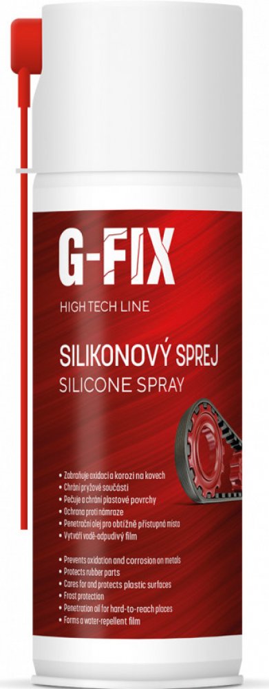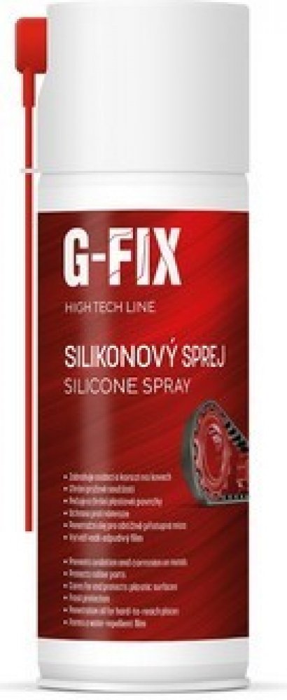 SILIKONOVÝ SPREJ G-FIX je kluzný, oddělovací, mazací, ochranný a impregnační prostředek proširoké spektrum průmyslových aplikací. Díky speciální kombinaci mnoha vysoce kvalitních silikonů,dosahuje vynikajících výsledků v oblasti výroby a údržby: strojírenství, elektrotechnický průmysl,výroba a oprava vozidel, zámečnické práce, dřevozpracující a papírnický průmysl.
