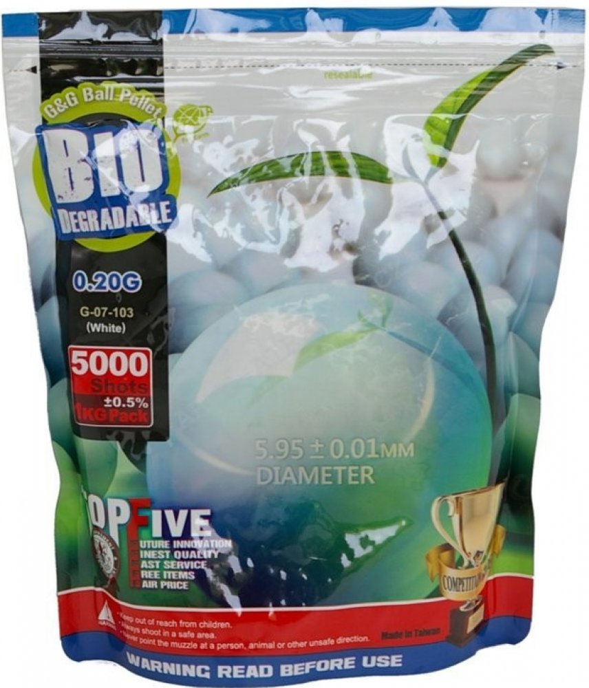 Airsoft kuličky 6mm GG BIO 0,20g, 5000,ks Kuličky vyráběné firmou GG armament jsou velmi kvalitní BIO kuličky vyrobené na Taiwanu. V přírodě se rozloží během 2 let. Díky velmi přesné toleranci +-0,01mm jsou vhodné pro všechny typy zbraní, včetně zbraní s těsnými hlavněmi. HLAVNÍ ZNAKY BIO KULIČEK GG 0,20G BIO střelivo vhodné pro všechny zbraně vysoká přesnost stabilnější dráha střely SPECIFIKACE BB BIO KULIČEK 0,20G výrobce: G&G země výroby: Taiwan ráže: BB6mm váha: 0,20 g počet kuliček v balení: 5000 ks materiál: 100% organický barva: bílá průměr: 5,95 mm +/- 0,01 obal: zatavený sáček s opakovaně uzavíratelným hrdlem
