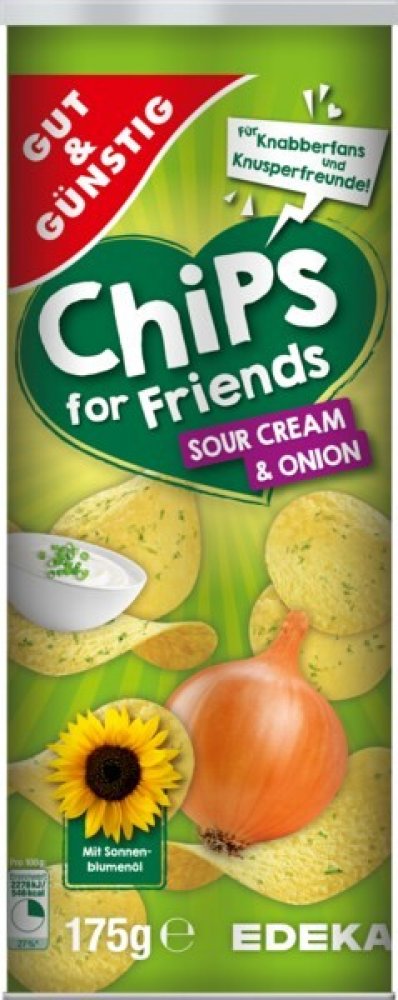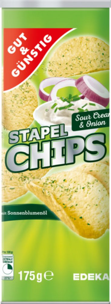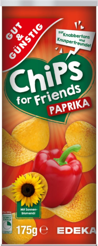 vyrobený z brambors paprikovým kořenímse slunečnicovým olejembez syntetického barvivaznačkaDOBRÉ A LEVNÉObsah prodeje / výnos175 gPokyny pro skladováníSkladujte v suchu a mimo teplo.Právní označeníStohovatelné hranolky vyrobené z brambor s příchutí paprikyKontaktEDEKA ZENTRALE AG Co. KG, D-22291 Hamburknutriční informacena 100 g (nepřipraveno) / RDA (v )Energie v kJ/kcal2 236 / 536 / 27Tuk (v gram...