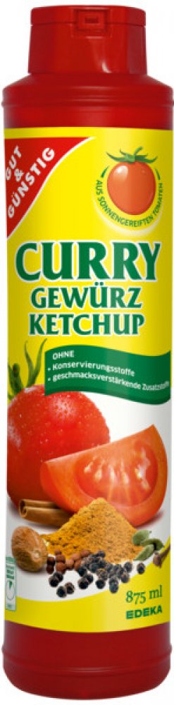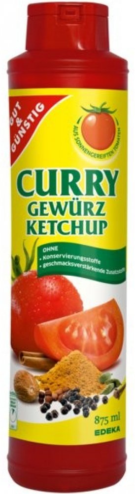 Složení: 23,5% rajčatová šťáva, voda, cukr, glukózový sirup, fruktóza, ocet, modifikovaný škrob, sůl, kari, koření, potravinářská barviva: karamel cukrového sirupu