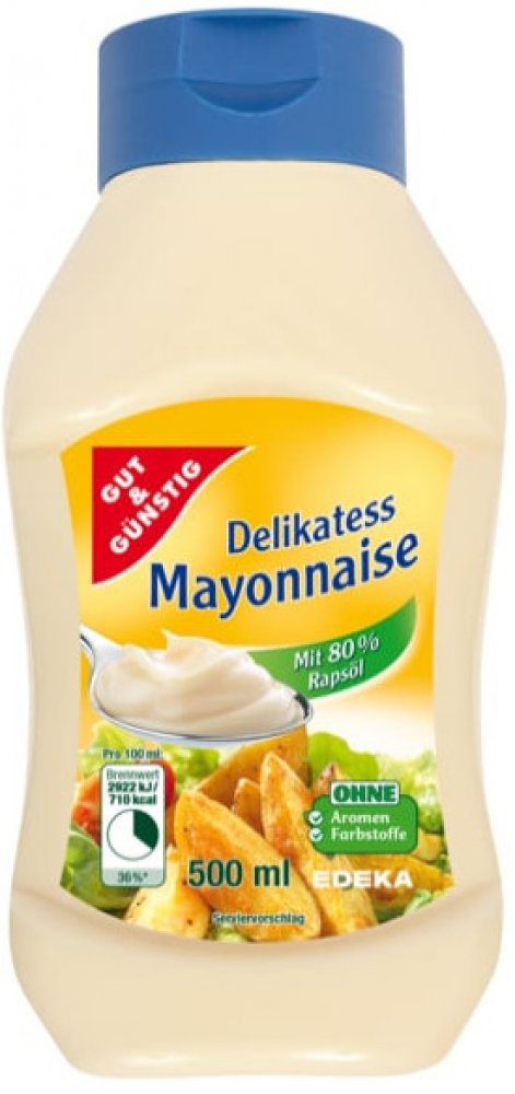 Složení: 80% řepkový olej, vaječné žloutky, vinný ocet, cukr, sůl, hořčičné semínko, kyselina citronová, antioxidant E385, koření