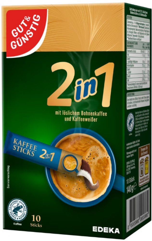 (rozpustná káva s kávovým bílým práškem): G&G Instantní káva 2v1 je vyrobena z kvalitní rozpustné kávy, která je směsí jemně mletých kávových zrn. Tento produkt je obohacen o kávový bílý prášek (kávový krém), což dodává kávě jemnou a krémovou chuť, kterou ocení každý milovník kávy, který preferuje hladkou, jemně sladkou chuť bez nutnosti přidávat cukr nebo mléko. Káva je připravena tak, aby vám poskytla plnou chuť v každém doušku, ať už si ji připravíte kdekoli.