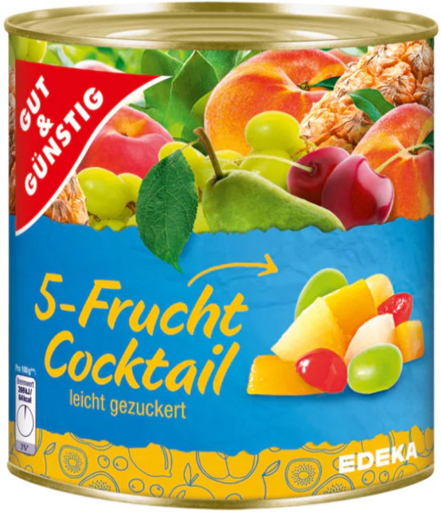 Složení: 60% ovoce v různém poměru (hrušky, broskve, ananas, hroznové víno, višně) voda, cukr, regulátor kyselosti: kyselina citronová