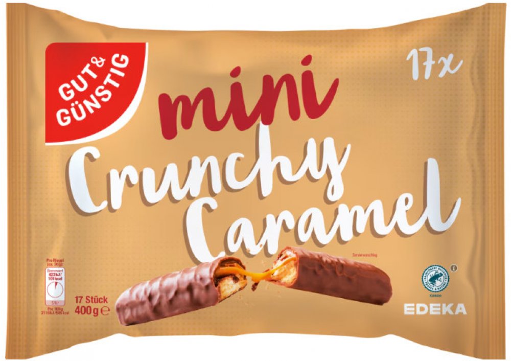 G&G Křupavé karamelové čokoládové tyčinky jsou lahodné křupavé tyčinky plněné křehkým sušenkovým základem, sladkým karamelem a pokryté mléčnou čokoládou, což vytváří ideální kombinaci sladké, křupavé a jemné chuti. Tyto tyčinky mají 36 % mléčné čokolády, 33 % karamelu a 31 % křehkého sušenky, čímž poskytují vynikající texturální kontrast mezi křehkými a krémovými složkami. Každá tyčinka je balena individuálně, což je činí ideálními pro snacking, sladkou pauzu nebo jako praktický sladký doplněk na cestách. G&G Křupavé karamelové čokoládové tyčinky jsou vyrobeny s kakaem z udržitelných a sociálně odpovědných plantáží díky certifikaci Rainforest Alliance a Cocoa for Future-Initiative, což znamená, že podpoříte udržitelný a etický zemědělský rozvoj.