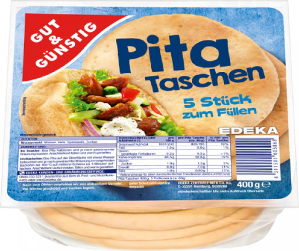 5 kusů k vyplněníz pšeničné moukytoast nebo péct krátce a naplňte podle potřebyseznam přísadSložení: PŠENICE, voda, droždí, stolní sůl, cukr.Nutriční informaceprůměrné nutriční hodnoty100 ml nebo gv jedné porci RM na 100 ml nebo g nebo na porciKalorická hodnota v kJ1031,00Kalorická hodnota v kcal243,00Tuk v g1,00Tuk, z toho nasycené mastné kyseliny vg0,20Sacharidy vg48,50Sacharidy, z toho cukr vg1,90Protein v g8.80Sůl v g1,00 RM = referenční částka pro průměrného dospělého (8 400 kJ / 2 000 kcal)Pokyny k přípravěToustovač: Pita a toast rozpůlte podle požadovaného zhnědnutí.Pak naplňte a užijte si teplé.Trouba: Pita na povrchu navlhčete malým množstvím vody a v závislosti na požadovaném zhnědnutí pečte v předehřáté troubě při 180 C ve středním stojanu asi 5 minut.Poté rozřízněte, naplňte a užívejte si teplé.Obsahuje následující alergeny, které vyžadují označeníObiloviny obsahující lepek a výrobky z nichPšenice a výrobky z níAdresa:EDEKA ZENTRALE AG a CO KGD-22291 Hamburg 5035296