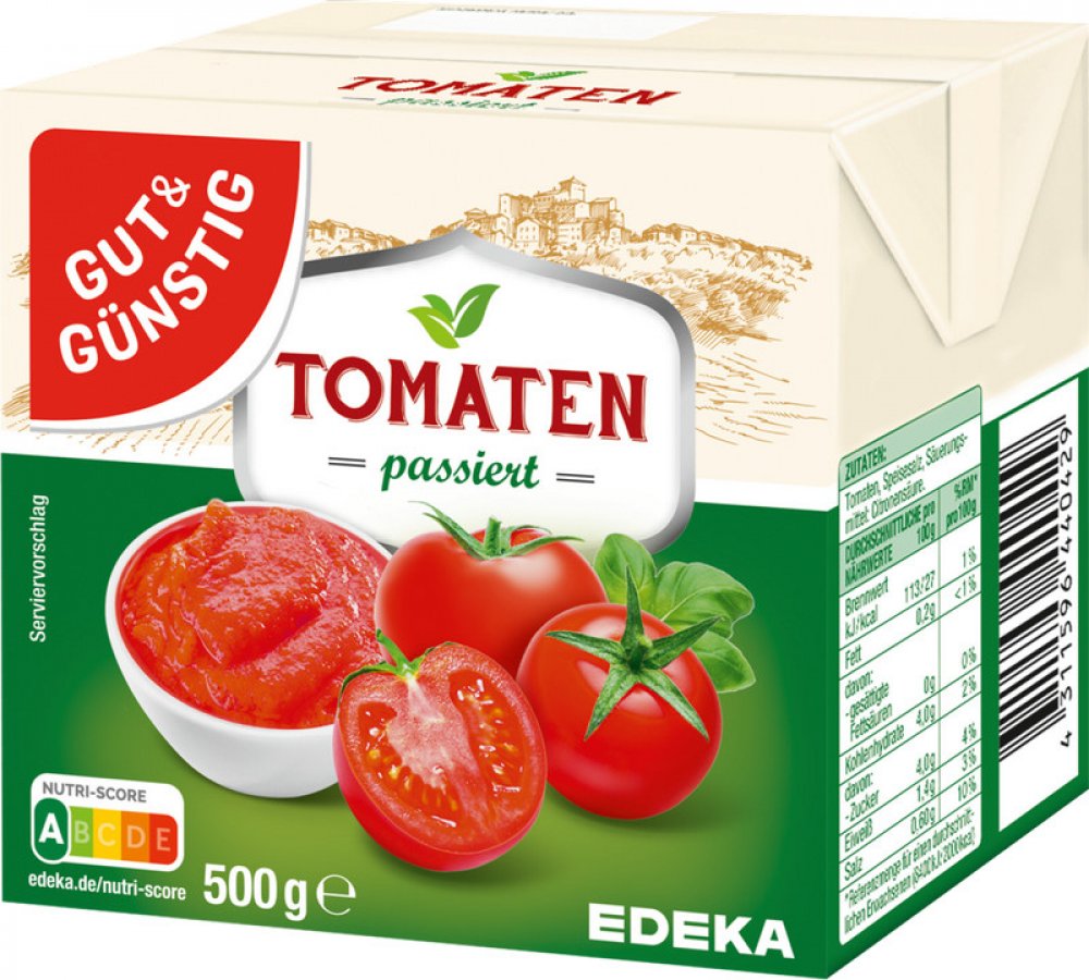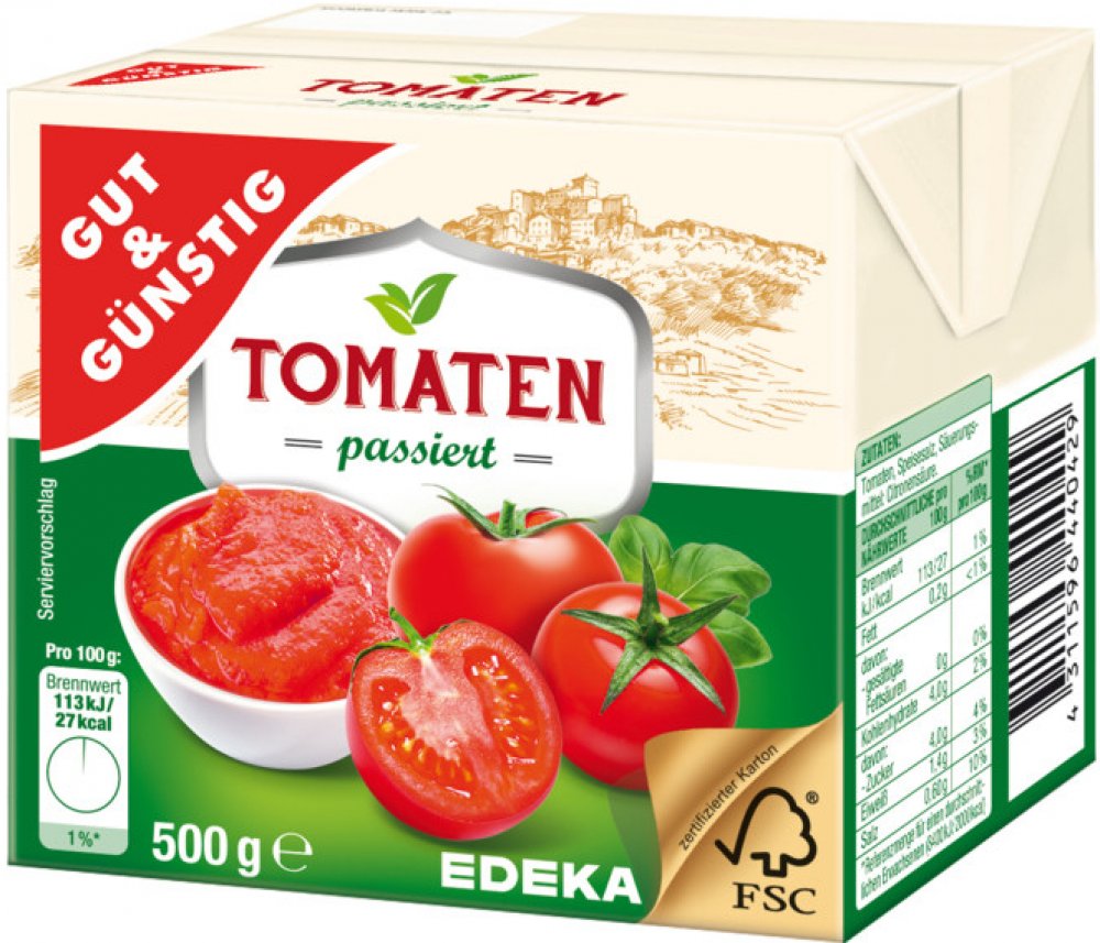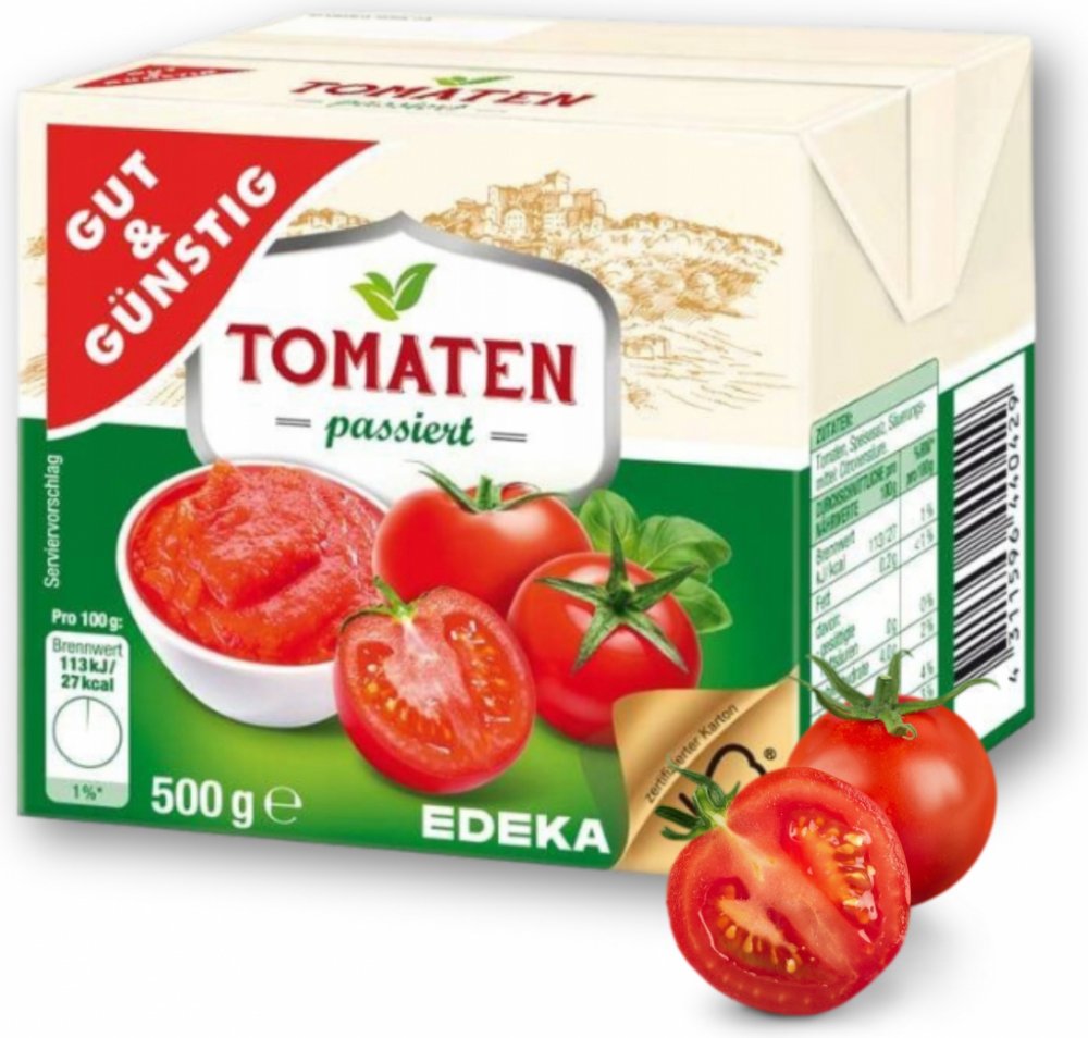 Od známé značky Gut und Gunstig. Pasýrovaná rajčata jsou balena v praktickém kartonovém balení.