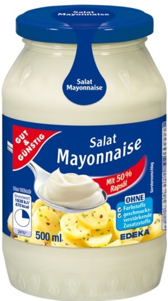 Nejen bramborový salát si zaslouží kvalitní majonézu bez barviv, aromat a zvýrazňovačů chuti. Dopřejte svému rozmazlovanému jazýčku vyváženou chuť majonézy a přidejte do pokrmů G&G salátovou majonézu. Vynikají salátová majonéza obsahuje 50 procent řepkového oleje a vejce od slepiček z volného výběhu. Jaký jiný výrobce si dává se složením majonézy takto záležet? G&G salátovou majonézu přidejte do tradičního vánočního bramborového salátu a během roku do dalších pokrmů, salátů a marinád.