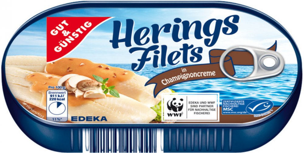 Vynikající sleďové filety zalévané lahodným krémem se žampiony. Oblíbená varianta pro milovníky hub. Vysoký podíl masa. Z kontrolovaného rybolovu v severním atlantiku.