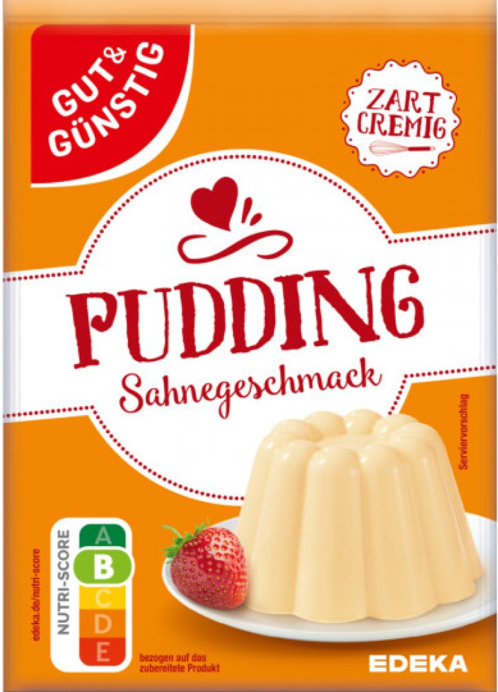 na 500 ml mléka v balenís příchutí smetany3 porce baleníAlergeny:Mléko a výrobky z něj (včetně laktózy)Název výrobce:EDEKA ZENTRALE Stiftung Co. KGAdresa výrobce:D-22291 HamburgNávod na zpracování:přidáme a za stálého míchání opět přivedeme k varu. 4. Pudink nalijte do dezertních skleniček nebo skleněné mísy a vychlaďte. Pudink lze po krátkém vychladnutí konzumovat i teplý. Na vyklopení: Vložte pudink do studené miskyPřidejte také: 500 ml nízkotučného mléka, 40 g (3 lžíce) cukru Hrnec na vaření: 1. Smíchejte pudink a cukr, poté smíchejte s cca 6 lžícemi mléko. 2. Zbývající mléko přivedeme k varu. 3. Mléko stáhněte ze sporáku a rozmixovaný pudinkPrávní název:Pudinkový prášek s příchutí smetany na 500 ml mlékaSeznam ingrediencí:Složení: škrob, jedlá sůl, přírodní příchuť KRÉM s dalšími přírodními příchutěmi (obsahuje MLÉKO), barviva: riboflaviny, annatto norbixin. Výrobek může obsahovat stopy OŘECHŮ.Pokyny pro skladování:Skladujte na chladném a suchém místě!Nutriční informacena 100 g neupraveného:Výhřevnost v