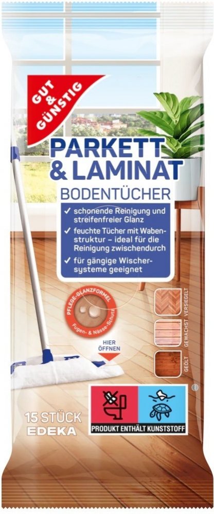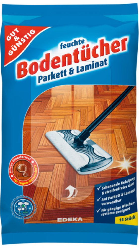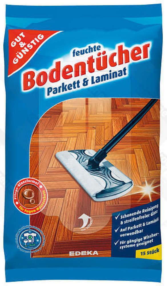 Gut und Günstig čistící hadr na parkety a plovoucí podlahy - 15ks speciální čistící hadr na dřevěné podlahy, parkety a laminátové podlahy s dýhou. Skvěle leští a udržuje dřevo lesklé. Dodává lesk a hloubku barvy. Jedná se o německý výrobek značky Edeka. V balení je 15ks hadrů. Hadr je na jedno použití.