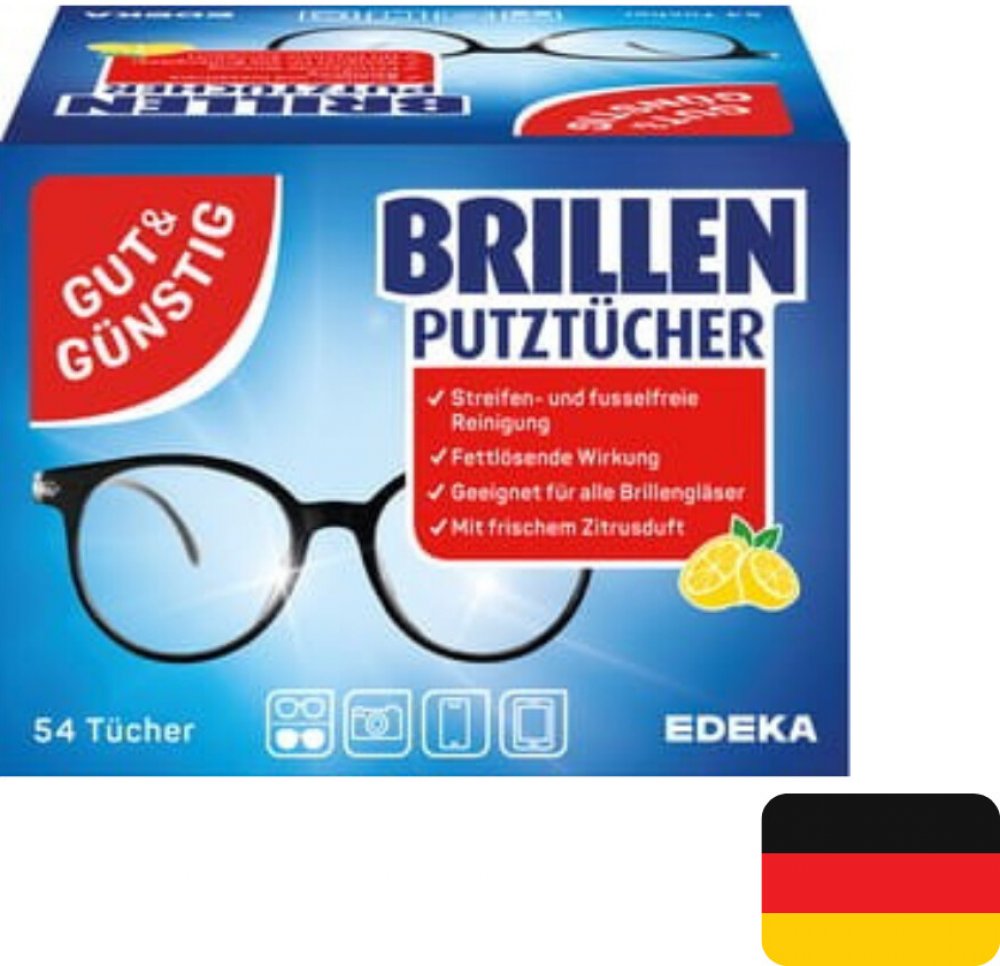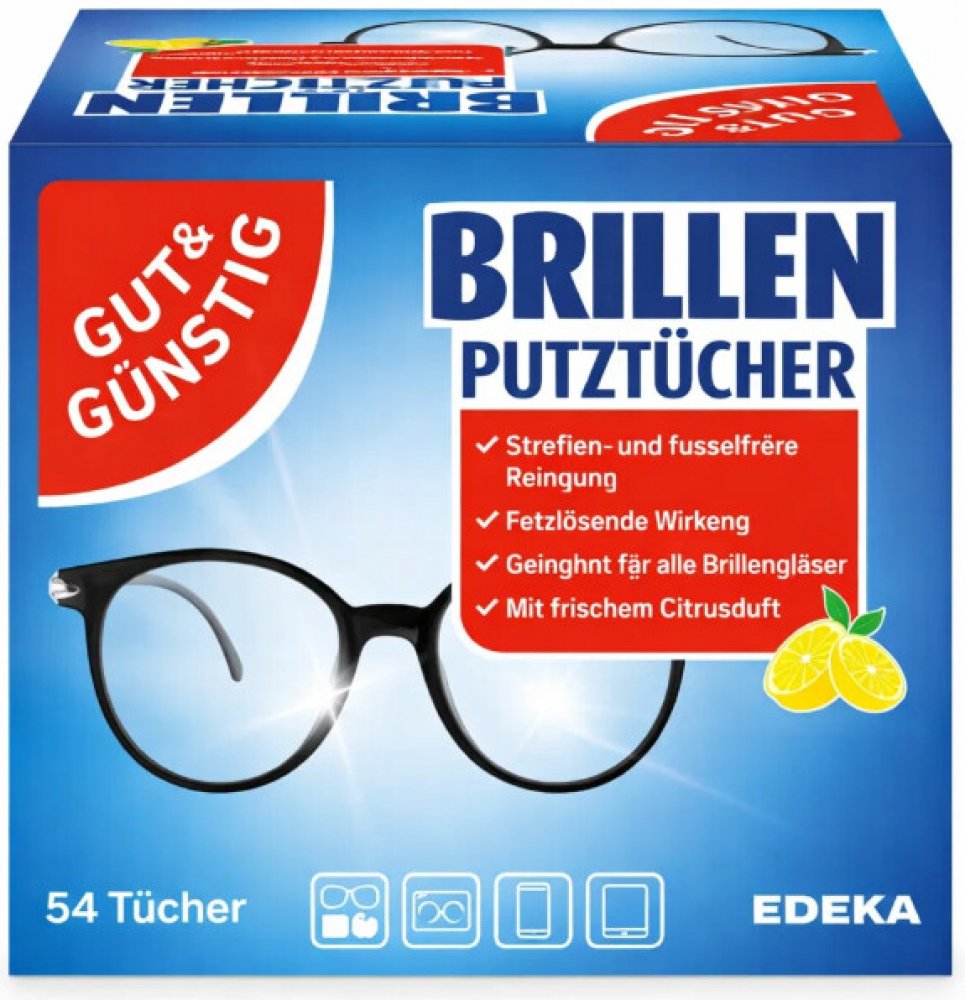 Gut & Günstig čistící ubrousky na brýle 54 ks - ubrousky s antistatickými účinky a s čerstvou citrusovou vůní jednotlivě balené v sáčcích. Použití těchto ubrousků se neomezuje pouze na brýlová skla. Lze s nimi důkladně vyčistit všechny hladké povrchy jako např. displeje mobilních telefonů, skla fotoaparátů, kamery, zrcadla atd. Velmi praktické při cestování.