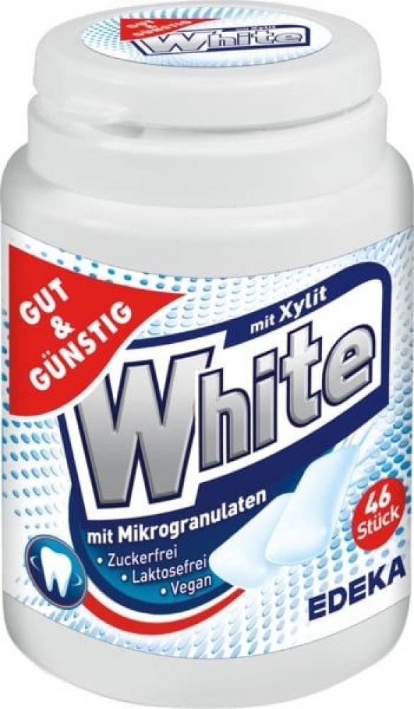 hmotnost 65 gs 30 xylitolems mikrogranulys příchutí máty46 potahovaných tablet v opětovně uzavíratelné nádoběseznam přísadSložení: sladidlo: 30 xylitol, sorbitol, mannitol, maltitol, aspartam, acesulfam K;Žvýkací hmota, aroma, plnivo: uhličitan vápenatý;Zahušťovadlo: arabská guma;Barvivo: oxid titaničitý;Emulgátor: lecitiny;Zvlhčovadlo: glycerin;Regulátor kyseliny: uhličitan sodný;Povlak: karnaubský vosk.nutriční informacePrůměrné nutriční hodnoty100 ml nebo gna porci RM na 100 ml nebo g nebo na porciKalorická hodnota v kJ657,008Kalorická hodnota v kcal158.008Tuk v g0.00Tuk, z toho nasycené mastné kyseliny vg0.00Sacharidy vg64,0025Sacharidy, z toho cukr vg0.00Sacharidy, včetně vícesytných alkoholů v g64,00Protein v g0.00Sůl v g0.081 RM = referenční částka pro průměrného dospělého (8 400 kJ / 2 000 kcal)AdresaEDEKA ZENTRALE AG Co. KG, D-22291 Hamburg