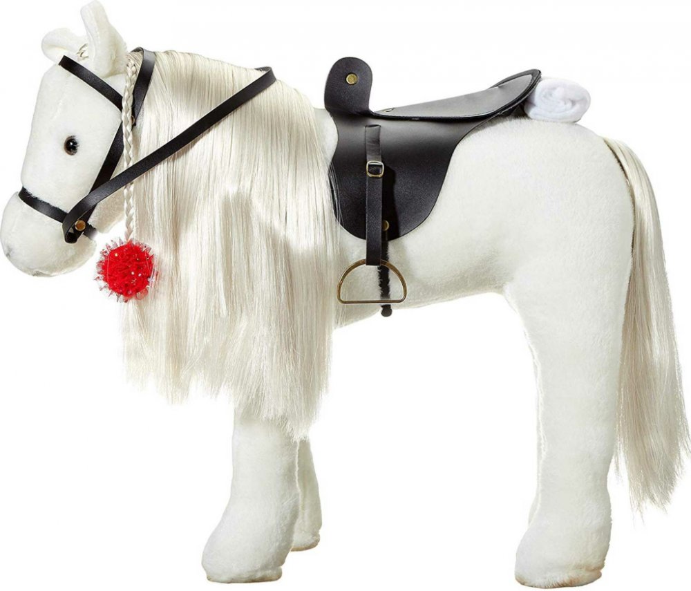 plyšového poníka (výška v kohoutku cca 37 cm, výška s hlavou cca 50 cm)sedlouzdudečkukartáč na vlasysponku do vlasů