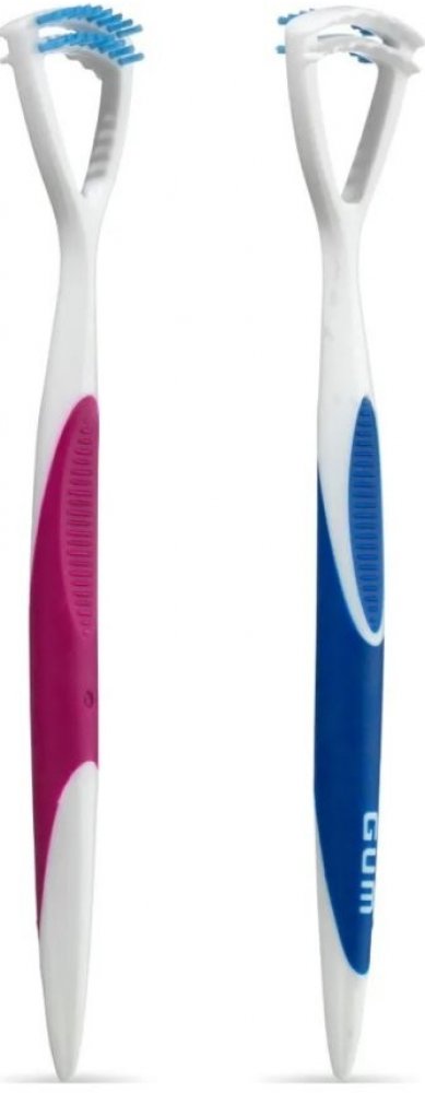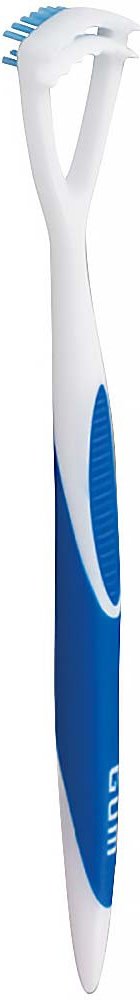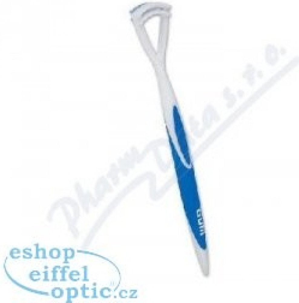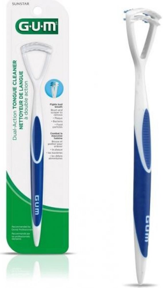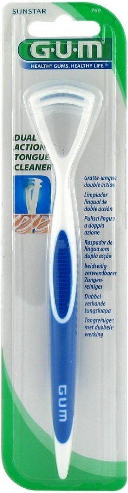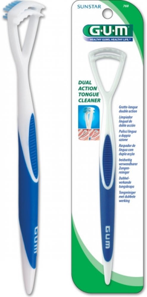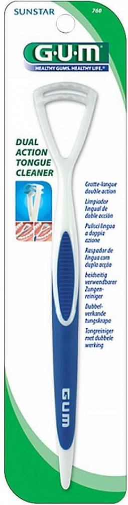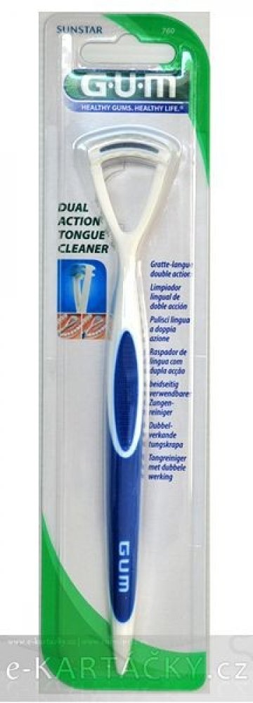 GUM škrabka na jazyk Dual Action G760MB kombinuje škrabku a kartáček na jazyk. Na jedné straně dvouřadý kartáček šetrně odstraňuje povlak z povrchu jazyka a na druhé straně škrabka povrch jazyka dočisťuje. Škrabka nevyvolává dávivý reflex při čištění povrchu jazyka.